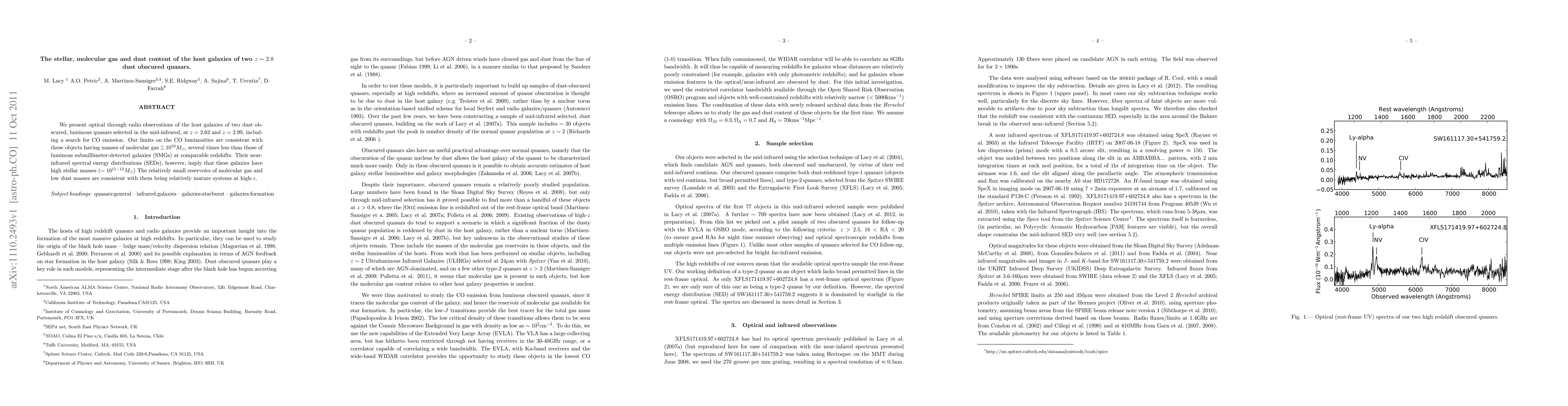 We present optical through radio observations of the host galaxies of two dust obscured, luminous quasars selected in the mid-infrared, at z=2.62 and z=2.99, including a search for CO emission. Our limits on the CO luminosities are consistent with these objects having masses of molecular gas <~10^10 solar masses, several times less than those of luminous submillimeter-detected galaxies (SMGs) at comparable redshifts. Their near-infrared spectral energy distributions, however, imply that these galaxies have high stellar masses (~10^11-12 solar masses). The relatively small reservoirs of molecular gas and low dust masses are consistent with them being relatively mature systems at high-z.