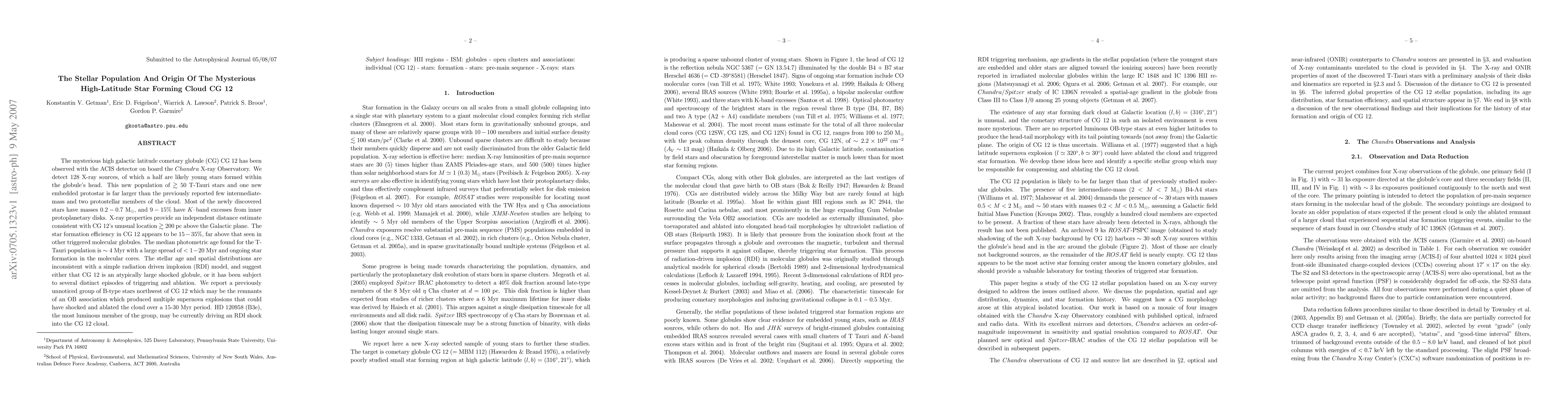 The mysterious high galactic latitude cometary globule CG12 has been observed with the ACIS detector on board the Chandra X-ray Observatory. We detect 128 X-ray sources; half are likely young stars formed within the globule's head. This new population of >50 T-Tauri stars and one new embedded protostar is far larger than the previously reported few intermediate-mass and two protostellar members of the cloud. Most of the newly discovered stars have masses 0.2-0.7Mo, and 9-15% have K-band excesses from inner protoplanetary disks. X-ray properties provide an independent distance estimate consistent with CG12's unusual location >200pc above the Galactic plane. The star formation efficiency in CG12 appears to be 15-35%, far above that seen in other triggered molecular globules. The median photometric age found for the T-Tauri population is ~4Myr with a large spread of <1-20Myr and ongoing star formation in the molecular cores. The stellar age and spatial distributions are inconsistent with a simple radiation driven implosion (RDI) model, and suggest either that CG12 is an atypically large shocked globule, or it has been subject to several distinct episodes of triggering and ablation. We report a previously unnoticed group of B-type stars northwest of CG12 which may be the remnants of an OB association which produced multiple supernova explosions that could have shocked and ablated the cloud over a 15-30Myr period. HD120958 (B3e), the most luminous member of the group, may be currently driving an RDI shock into the CG12 cloud.