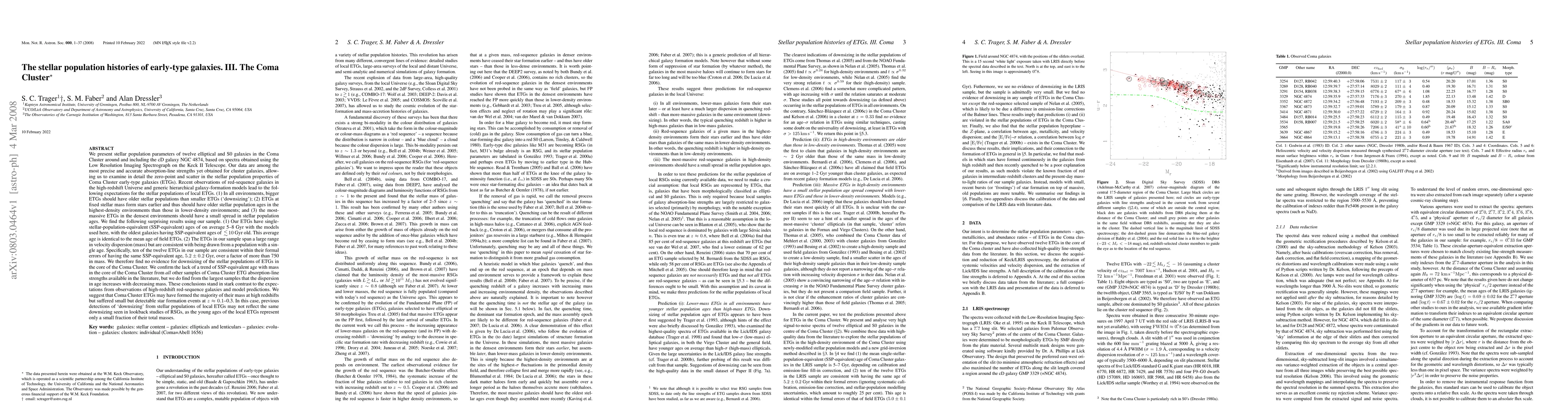 This paper analyzes the stellar population histories of twelve early-type galaxies in the Coma Cluster, finding they have average ages of 5-8 Gyr, with ten galaxies consistent in age at 5.2±0.2 Gyr. The study suggests no evidence for downsizing in stellar populations and proposes that these galaxies formed most of their mass at high redshifts with minor star formation events at lower redshifts.