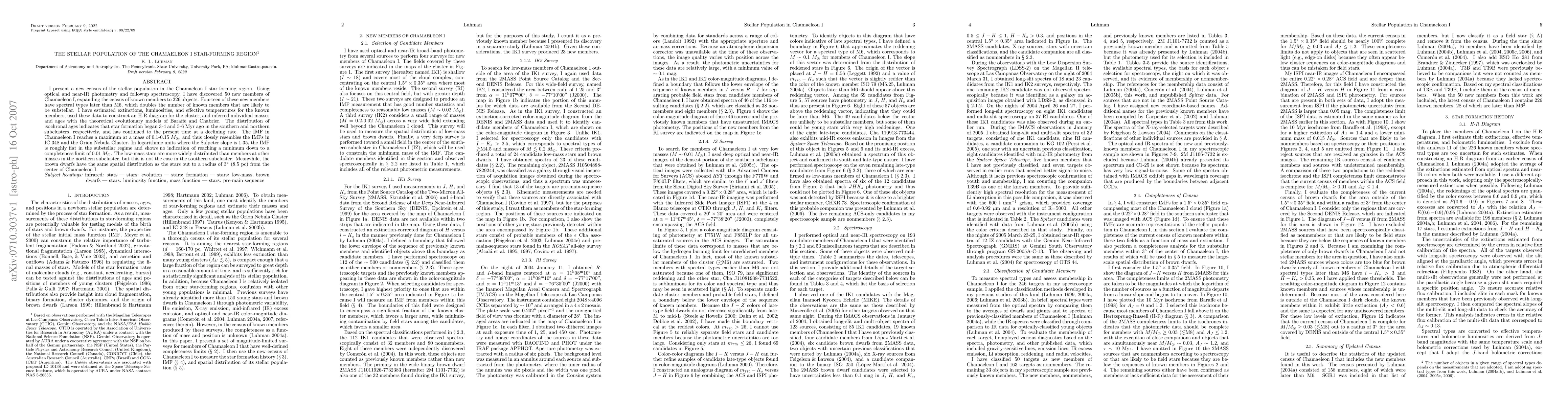 This paper presents a new census of the Chamaeleon I star-forming region, discovering 50 new members and expanding the total to 226, including 14 substellar objects. The study infers ages and masses, revealing ongoing star formation and a flat initial mass function (IMF) in the substellar regime.