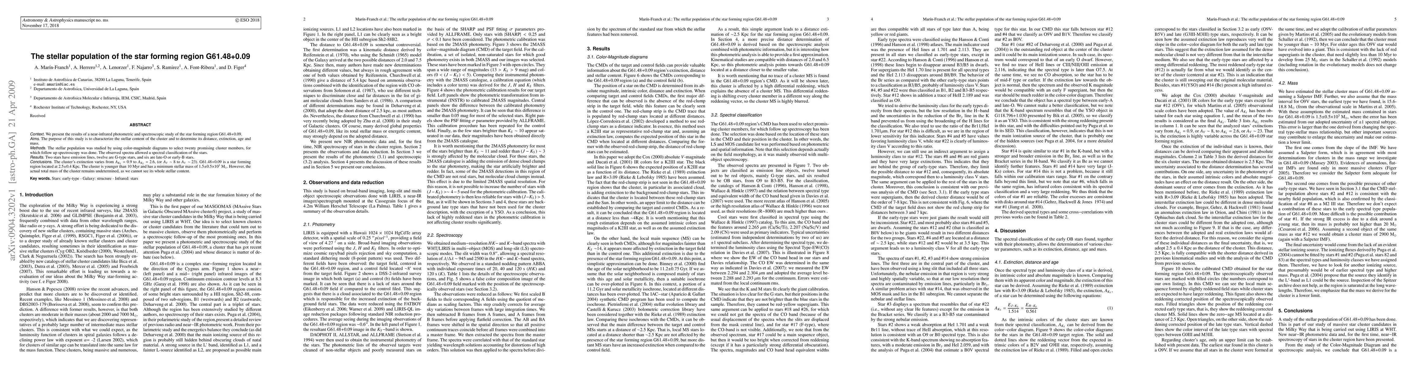 - Context: We present the results of a near-infrared photometric and spectroscopic study of the star forming region G61.48+0.09. - Aims: The purpose of this study is to characterize the stellar content of the cluster and to determine its distance, extinction, age and mass. - Methods: The stellar population was studied by using color-magnitude diagrams to select twenty promising cluster members, for which follow up spectroscopy was done. The observed spectra allowed a spectral classification of the stars. - Results: Two stars have emission lines, twelve are G-type stars, and six are late-O or early-B stars. - Conclusions: The cluster's extinction varies from A_{K_S} = 0.9 to A_{K_S} = 2.6, (or A_{V}~8 to A_{V}~23). G61.48+0.09 is a star forming region located at 2.5+/-0.4 Kpc. The cluster is younger than 10 Myr and has a minimum stellar mass of 1500+/-500 Solar masses. However, the actual total mass of the cluster remains undetermined, as we cannot see its whole stellar content.