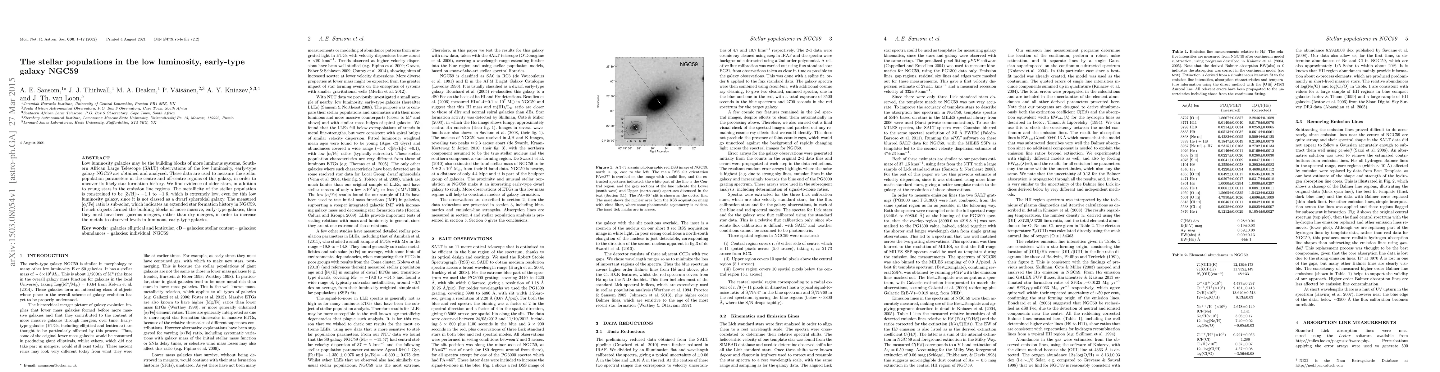 Low luminosity galaxies may be the building blocks of more luminous systems. Southern African Large Telescope (SALT) observations of the low luminosity, early-type galaxy NGC59 are obtained and analysed. These data are used to measure the stellar population parameters in the centre and off-centre regions of this galaxy, in order to uncover its likely star formation history. We find evidence of older stars, in addition to young stars in the emission line regions. The metallicity of the stellar population is constrained to be [Z/H] ~ -1.1 to -1.6, which is extremely low, even for this low luminosity galaxy, since it is not classed as a dwarf spheroidal galaxy. The measured [alpha/Fe] ratio is sub-solar, which indicates an extended star formation history in NGC59. If such objects formed the building blocks of more massive, early-type galaxies, then they must have been gaseous mergers, rather than dry mergers, in order to increase the metals to observed levels in luminous, early-type galaxies.