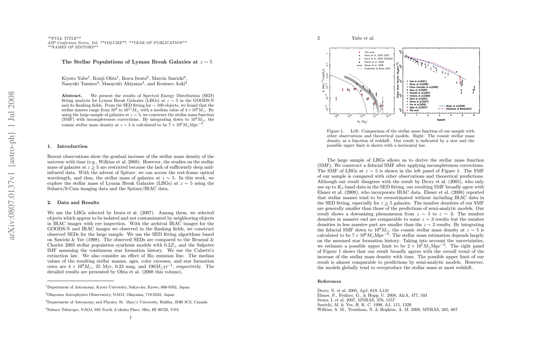 We present the results of Spectral Energy Distribution (SED) fitting analysis for Lyman Break Galaxies (LBGs) at $z\sim5$ in the GOODS-N and its flanking fields. From the SED fitting for $\sim100$ objects, we found that the stellar masses range from $10^{8}$ to $10^{11}M_{\odot}$ with a median value of $4\times10^{9}M_{\odot}$. By using the large sample of galaxies at $z\sim5$, we construct the stellar mass function (SMF) with incompleteness corrections. By integrating down to $10^{8}M_{\odot}$, the cosmic stellar mass density at $z\sim5$ is calculated to be $7\times10^{6}M_{\odot}\textrm{Mpc}^{-3}$.