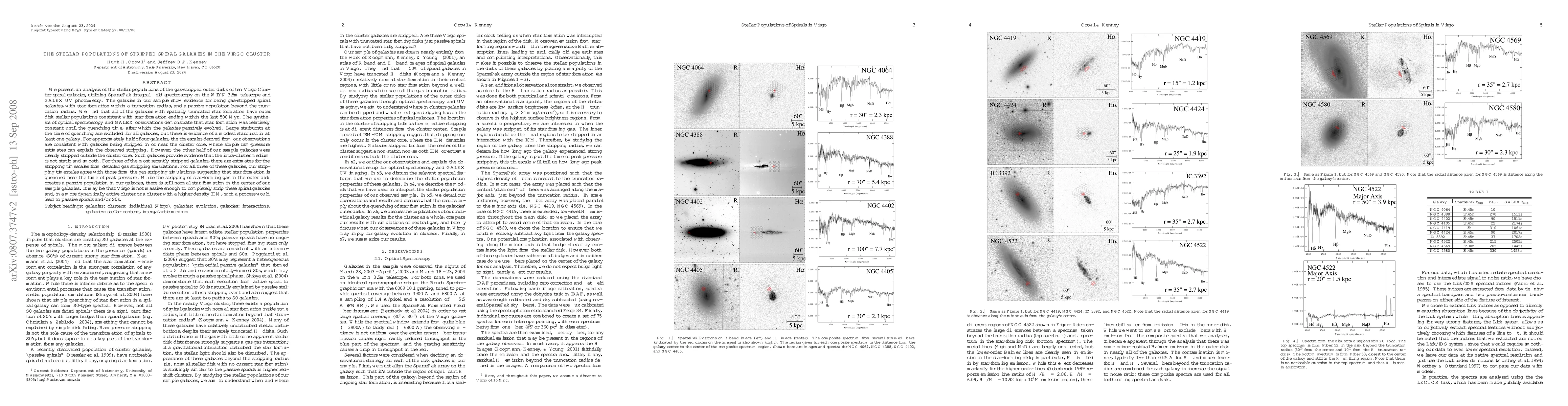 This study analyzes the stellar populations of gas-stripped spiral galaxies in the Virgo Cluster, finding evidence for truncated star formation within the last 500 Myr. The galaxies show passive evolution post-quenching, with half indicating stripping near the cluster core and the other half outside, suggesting dynamic intra-cluster medium processes.