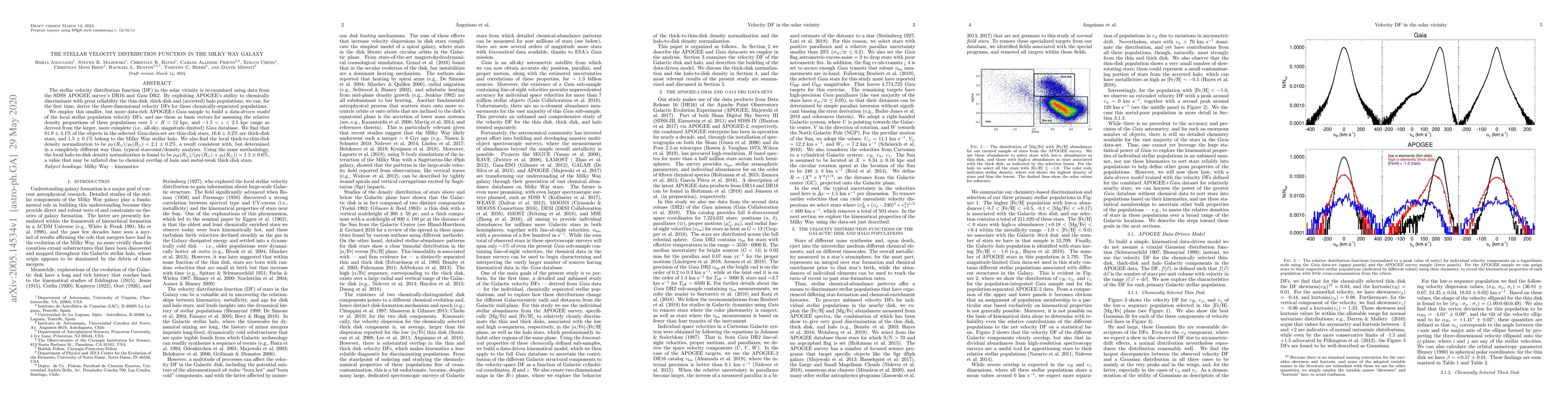 The stellar velocity distribution function (DF) in the solar vicinity is re-examined using data from the SDSS APOGEE survey's DR16 and \emph{Gaia} DR2. By exploiting APOGEE's ability to chemically discriminate with great reliability the thin disk, thick disk and (accreted) halo populations, we can, for the first time, derive the three-dimensional velocity DFs for these chemically-separated populations. We employ this smaller, but more data-rich APOGEE+{\it Gaia} sample to build a \emph{data-driven model} of the local stellar population velocity DFs, and use these as basis vectors for assessing the relative density proportions of these populations over 5 $<$ $R$ $<$ 12 kpc, and $-1.5$ $<$ $z$ $<$ 2.5 kpc range as derived from the larger, more complete (i.e., all-sky, magnitude-limited) {\it Gaia} database. We find that 81.9 $\pm$ 3.1$\%$ of the objects in the selected \emph{Gaia} data-set are thin-disk stars, 16.6 $\pm$ 3.2$\%$ are thick-disk stars, and 1.5 $\pm$ 0.1$\%$ belong to the Milky Way stellar halo. We also find the local thick-to-thin-disk density normalization to be $\rho_{T}(R_{\odot})$/$\rho_{t}(R_{\odot})$ = 2.1 $\pm$ 0.2$\%$, a result consistent with, but determined in a completely different way than, typical starcount/density analyses. Using the same methodology, the local halo-to-disk density normalization is found to be $\rho_{H}(R_{\odot})$/($\rho_{T}(R_{\odot})$ + $\rho_{t}(R_{\odot})$) = 1.2 $\pm$ 0.6$\%$, a value that may be inflated due to chemical overlap of halo and metal-weak thick disk stars.