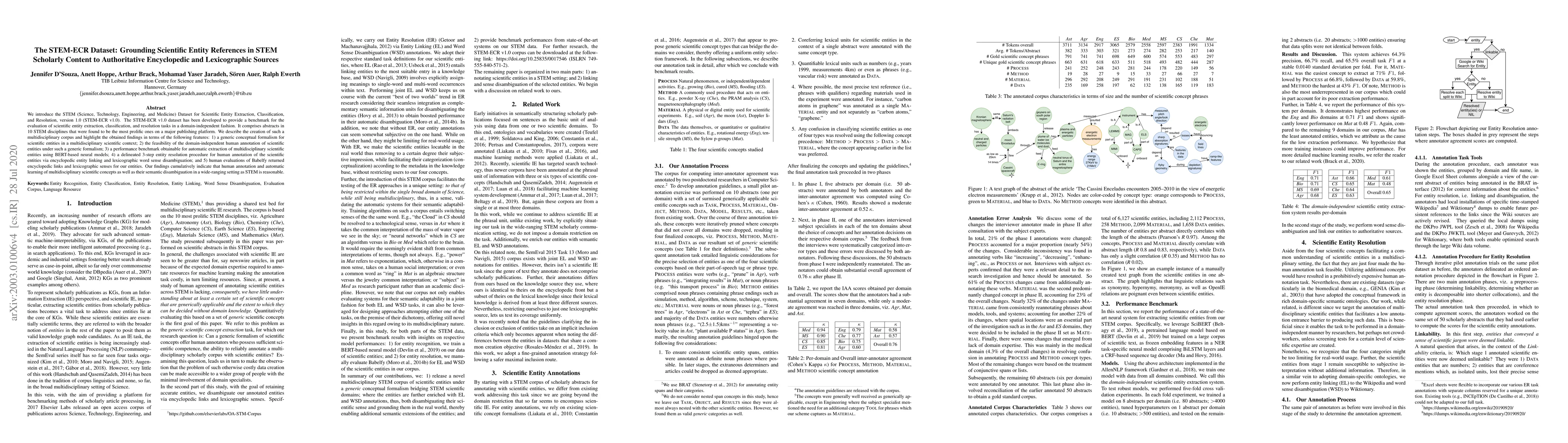 The STEM-ECR Dataset v1.0 provides a benchmark for scientific entity extraction, classification, and resolution across 10 STEM disciplines, demonstrating the feasibility of domain-independent human annotation and the effectiveness of BERT-based models for automatic extraction. The dataset also outlines a 3-step entity resolution procedure and evaluates encyclopedic links and lexicographic senses.