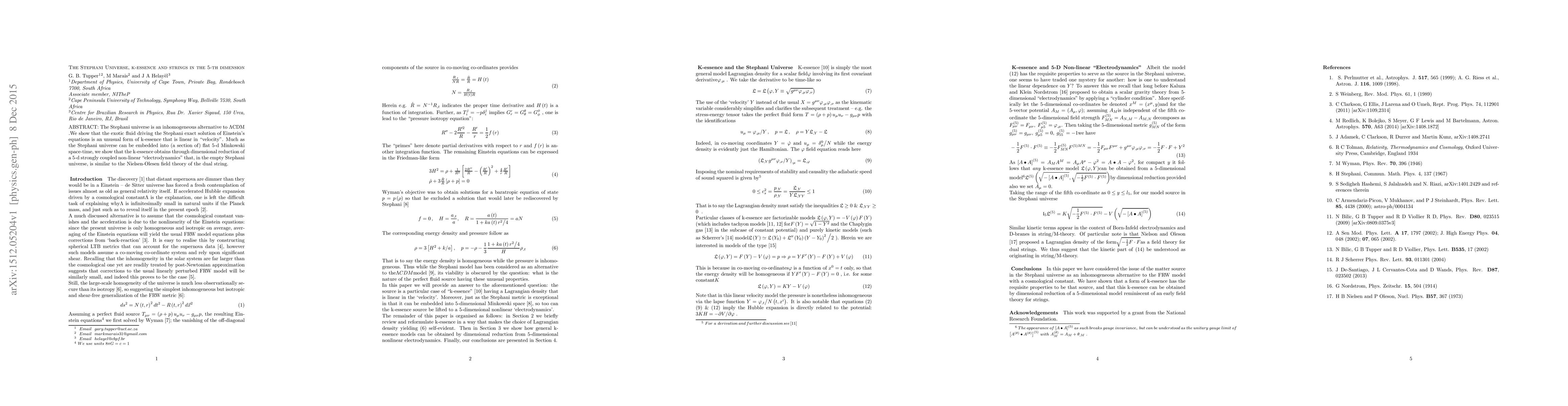 The Stephani universe is an inhomogeneous alternative to $\Lambda{\rm CDM}$ .We show that the exotic fluid driving the Stephani exact solution of Einstein's equations is an unusual form of k-essence that is linear in "velocity". Much as the Stephani universe can be embedded into (a section of) flat 5-d Minkowski space-time, we show that the k-essence obtains through dimensional reduction of a 5-d strongly coupled non-linear "electrodynamics" that, in the empty Stephani universe, is similar to the Nielsen-Olesen field theory of the dual string.