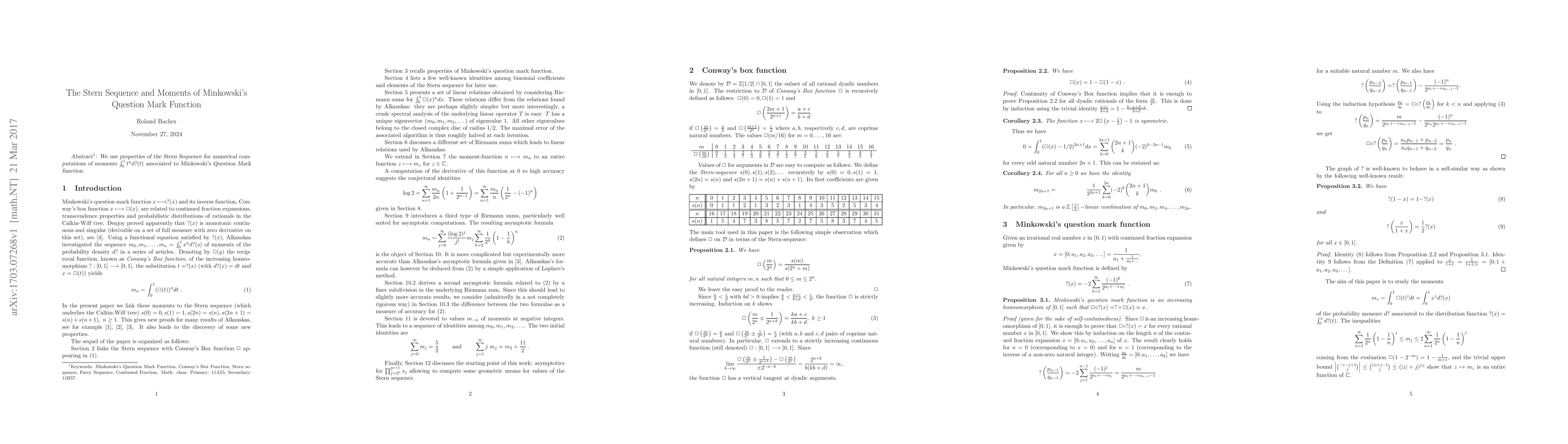 1 : We use properties of the Stern Sequence for numerical computations of moments $\int^1_0 t^n d?(t)$ associated to Minkowski's Question Mark function.
