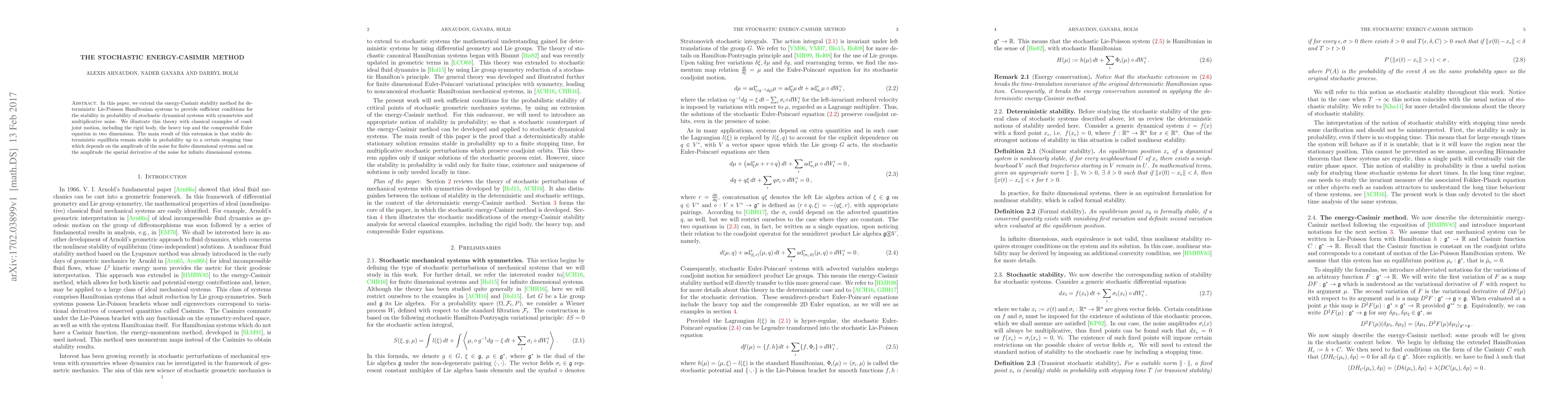 In this paper, we extend the energy-Casimir stability method for deterministic Lie-Poisson Hamiltonian systems to provide sufficient conditions for the stability in probability of stochastic dynamical systems with symmetries and multiplicative noise. We illustrate this theory with classical examples of coadjoint motion, including the rigid body, the heavy top and the compressible Euler equation in two dimensions. The main result of this extension is that stable deterministic equilibria remain stable in probability up to a certain stopping time which depends on the amplitude of the noise for finite dimensional systems and on the amplitude the spatial derivative of the noise for infinite dimensional systems.