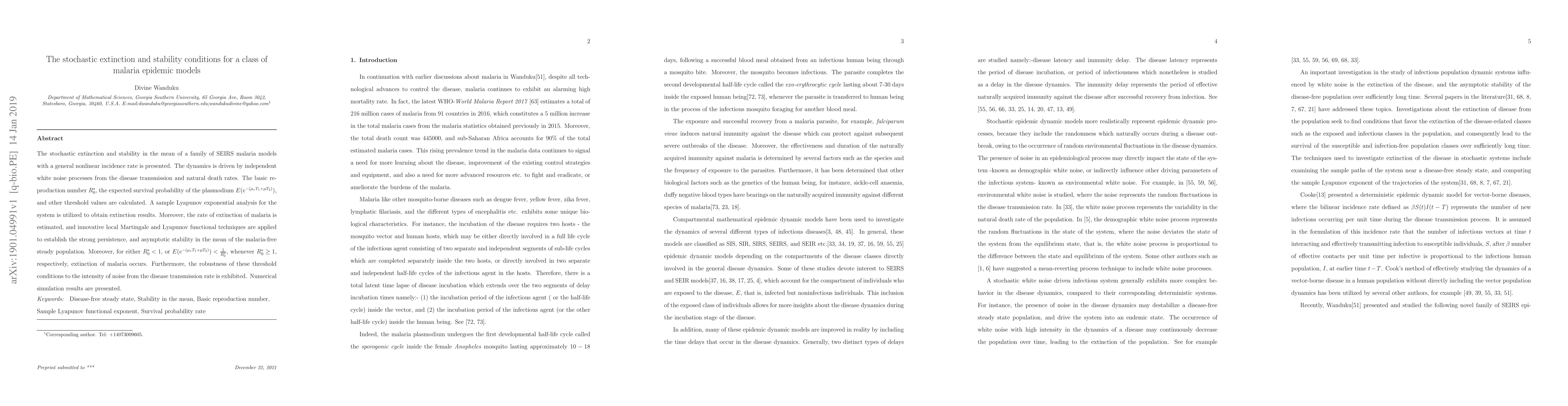 This paper investigates stochastic extinction and stability in a class of SEIRS malaria models with nonlinear incidence rates, driven by white noise. It calculates the basic reproduction number $R^{*}_{0}$ and survival probability thresholds, and uses Lyapunov analysis to establish extinction and persistence conditions, showing that malaria extinction depends on $R^{*}_{0}$ and survival probability, with robustness to noise intensity.