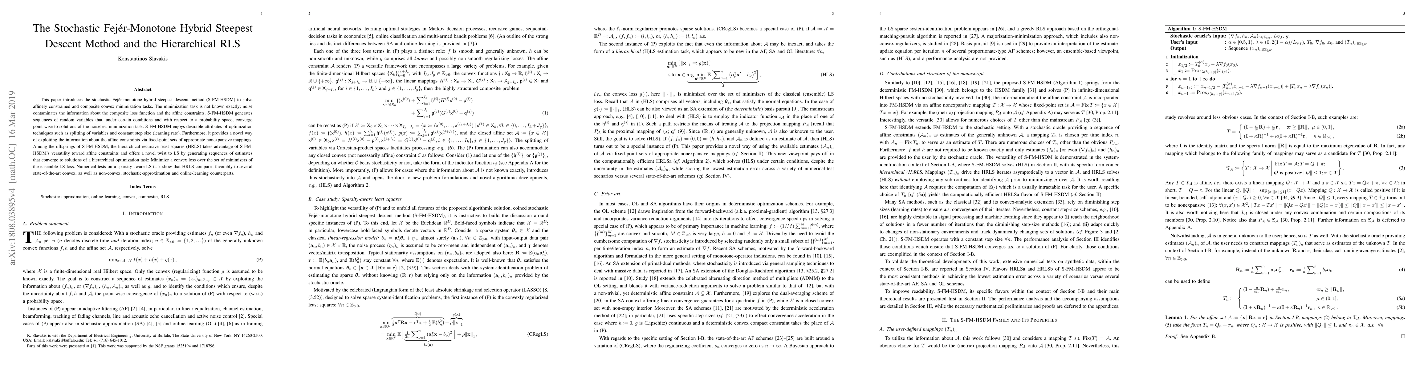 This paper introduces the stochastic Fej\'{e}r-monotone hybrid steepest descent method (S-FM-HSDM) to solve affinely constrained and composite convex minimization tasks. The minimization task is not known exactly; noise contaminates the information about the composite loss function and the affine constraints. S-FM-HSDM generates sequences of random variables that, under certain conditions and with respect to a probability space, converge point-wise to solutions of the noiseless minimization task. S-FM-HSDM enjoys desirable attributes of optimization techniques such as splitting of variables and constant step size (learning rate). Furthermore, it provides a novel way of exploiting the information about the affine constraints via fixed-point sets of appropriate nonexpansive mappings. Among the offsprings of S-FM-HSDM, the hierarchical recursive least squares (HRLS) takes advantage of S-FM-HSDM's versatility toward affine constraints and offers a novel twist to LS by generating sequences of estimates that converge to solutions of a hierarchical optimization task: Minimize a convex loss over the set of minimizers of the ensemble LS loss. Numerical tests on a sparsity-aware LS task show that HRLS compares favorably to several state-of-the-art convex, as well as non-convex, stochastic-approximation and online-learning counterparts.