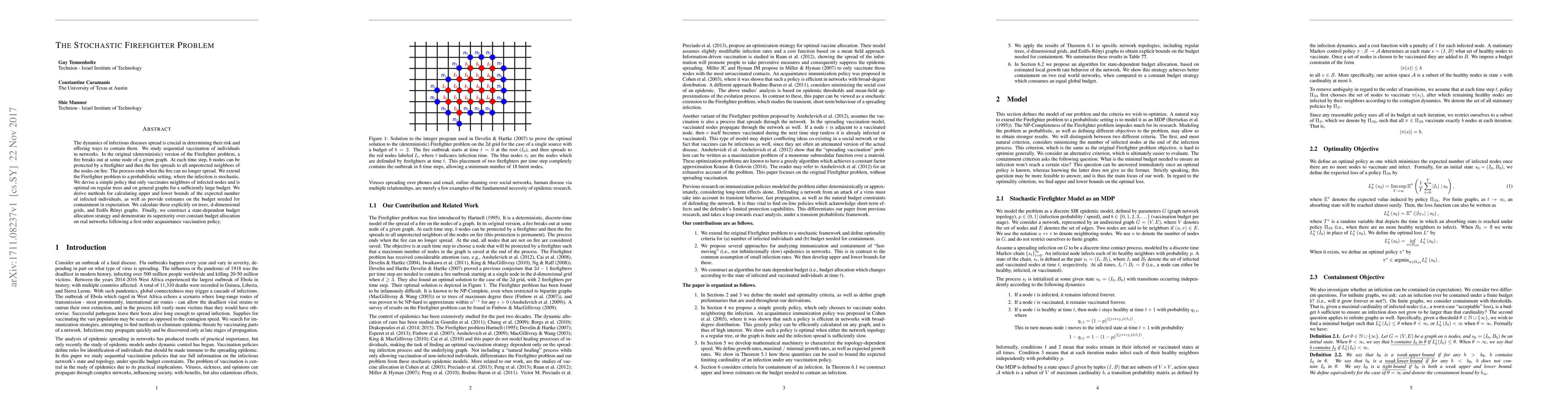 The dynamics of infectious diseases spread is crucial in determining their risk and offering ways to contain them. We study sequential vaccination of individuals in networks. In the original (deterministic) version of the Firefighter problem, a fire breaks out at some node of a given graph. At each time step, b nodes can be protected by a firefighter and then the fire spreads to all unprotected neighbors of the nodes on fire. The process ends when the fire can no longer spread. We extend the Firefighter problem to a probabilistic setting, where the infection is stochastic. We devise a simple policy that only vaccinates neighbors of infected nodes and is optimal on regular trees and on general graphs for a sufficiently large budget. We derive methods for calculating upper and lower bounds of the expected number of infected individuals, as well as provide estimates on the budget needed for containment in expectation. We calculate these explicitly on trees, d-dimensional grids, and Erd\H{o}s R\'{e}nyi graphs. Finally, we construct a state-dependent budget allocation strategy and demonstrate its superiority over constant budget allocation on real networks following a first order acquaintance vaccination policy.
