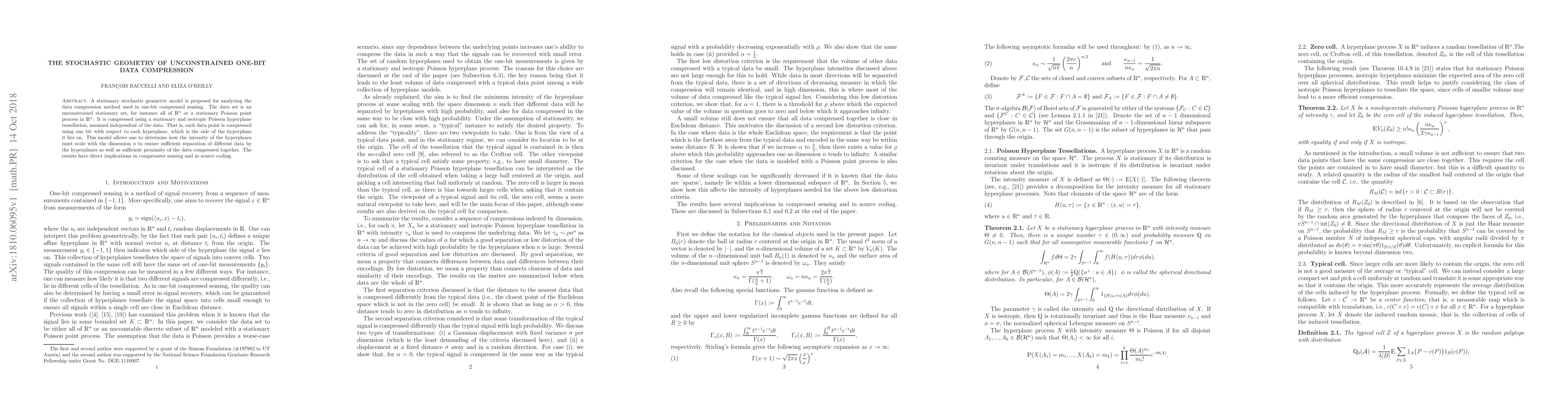 A stationary stochastic geometric model is proposed for analyzing the data compression method used in one-bit compressed sensing. The data set is an unconstrained stationary set, for instance all of $\mathbb{R}^n$ or a stationary Poisson point process in $\mathbb{R}^n$. It is compressed using a stationary and isotropic Poisson hyperplane tessellation, assumed independent of the data. That is, each data point is compressed using one bit with respect to each hyperplane, which is the side of the hyperplane it lies on. This model allows one to determine how the intensity of the hyperplanes must scale with the dimension $n$ to ensure sufficient separation of different data by the hyperplanes as well as sufficient proximity of the data compressed together. The results have direct implications in compressive sensing and in source coding.