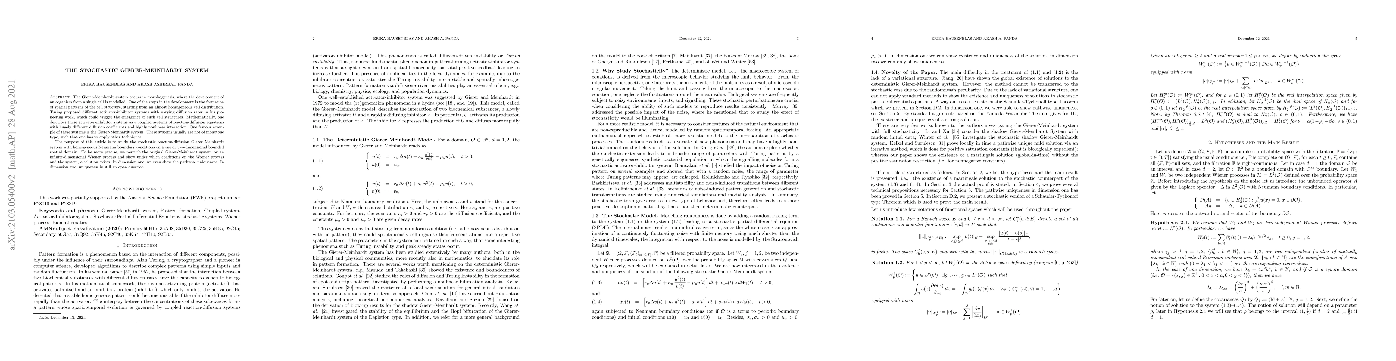 This paper investigates the stochastic Gierer-Meinhardt system, a model for morphogenesis, by introducing perturbations via an infinite-dimensional Wiener process. The authors demonstrate the existence of solutions under specific conditions and show pathwise uniqueness in one dimension, while the uniqueness in two dimensions remains an open question.