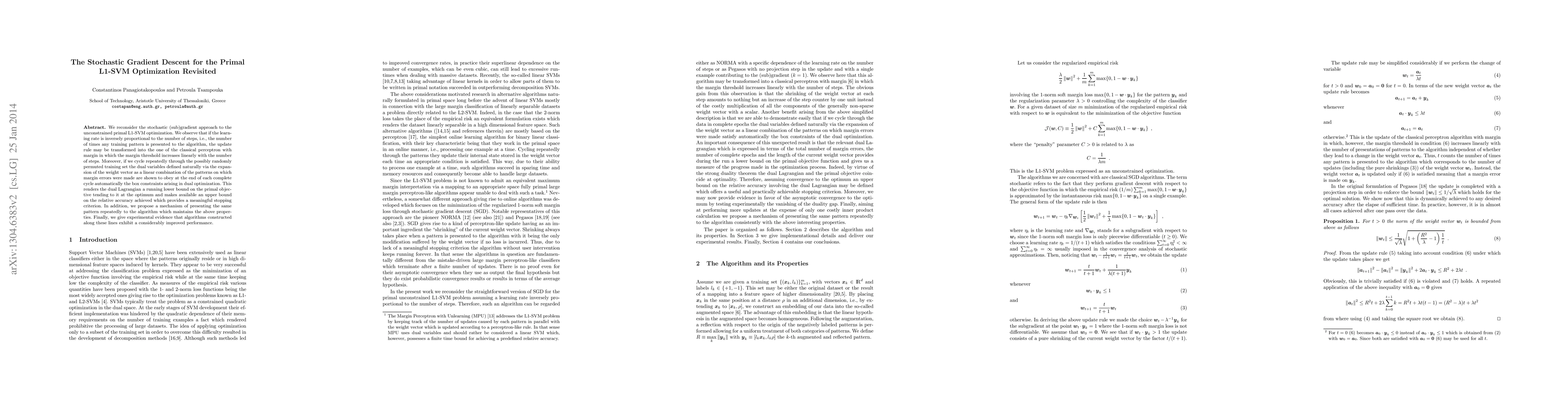 We reconsider the stochastic (sub)gradient approach to the unconstrained primal L1-SVM optimization. We observe that if the learning rate is inversely proportional to the number of steps, i.e., the number of times any training pattern is presented to the algorithm, the update rule may be transformed into the one of the classical perceptron with margin in which the margin threshold increases linearly with the number of steps. Moreover, if we cycle repeatedly through the possibly randomly permuted training set the dual variables defined naturally via the expansion of the weight vector as a linear combination of the patterns on which margin errors were made are shown to obey at the end of each complete cycle automatically the box constraints arising in dual optimization. This renders the dual Lagrangian a running lower bound on the primal objective tending to it at the optimum and makes available an upper bound on the relative accuracy achieved which provides a meaningful stopping criterion. In addition, we propose a mechanism of presenting the same pattern repeatedly to the algorithm which maintains the above properties. Finally, we give experimental evidence that algorithms constructed along these lines exhibit a considerably improved performance.