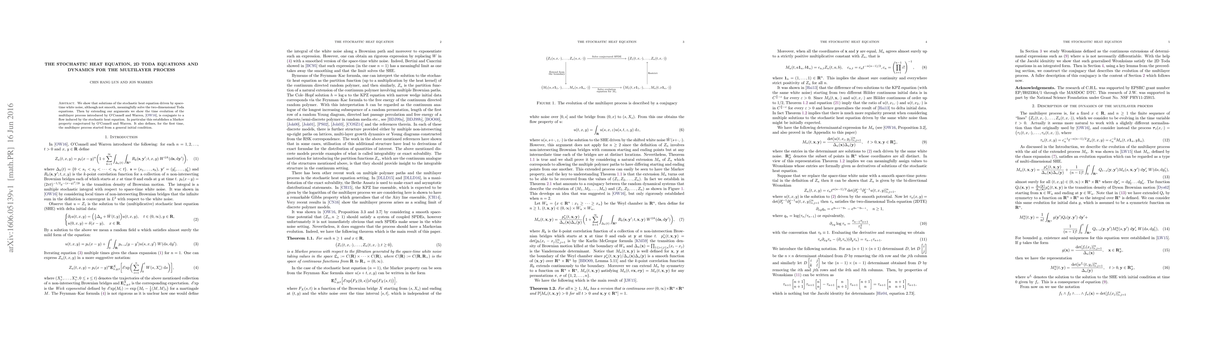 We show that solutions of the stochastic heat equation driven by space-time white noise, although not smooth, meaningfully solve the two-dimensional Toda equations. Then by extending our arguments we show the time evolution of the multilayer process introduced by O'Connell and Warren is conjugate to a flow induced by the stochastic heat equation. In particular this establishes a Markov property conjectured by O'Connell and Warren. It also defines, for the first time, the multilayer process started from a general initial condition.