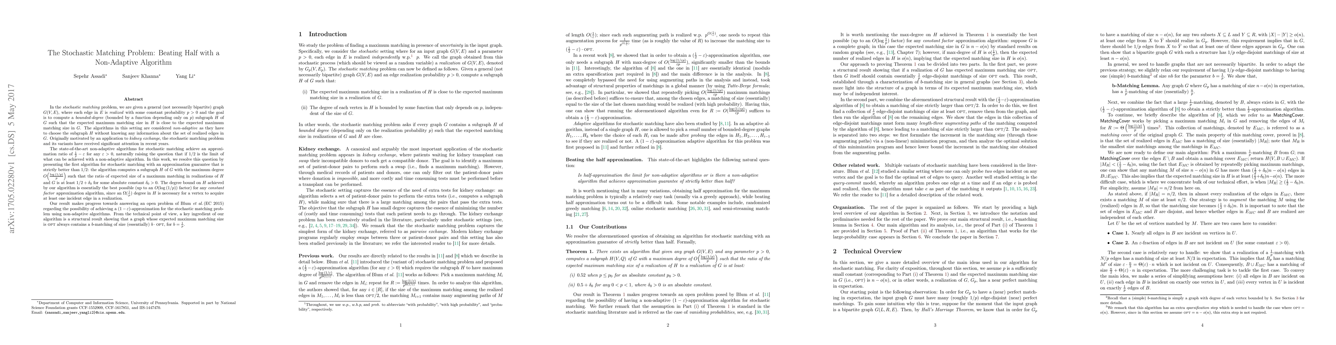 In the stochastic matching problem, we are given a general (not necessarily bipartite) graph $G(V,E)$, where each edge in $E$ is realized with some constant probability $p > 0$ and the goal is to compute a bounded-degree (bounded by a function depending only on $p$) subgraph $H$ of $G$ such that the expected maximum matching size in $H$ is close to the expected maximum matching size in $G$. The algorithms in this setting are considered non-adaptive as they have to choose the subgraph $H$ without knowing any information about the set of realized edges in $G$. Originally motivated by an application to kidney exchange, the stochastic matching problem and its variants have received significant attention in recent years. The state-of-the-art non-adaptive algorithms for stochastic matching achieve an approximation ratio of $\frac{1}{2}-\epsilon$ for any $\epsilon > 0$, naturally raising the question that if $1/2$ is the limit of what can be achieved with a non-adaptive algorithm. In this work, we resolve this question by presenting the first algorithm for stochastic matching with an approximation guarantee that is strictly better than $1/2$: the algorithm computes a subgraph $H$ of $G$ with the maximum degree $O(\frac{\log{(1/ p)}}{p})$ such that the ratio of expected size of a maximum matching in realizations of $H$ and $G$ is at least $1/2+\delta_0$ for some absolute constant $\delta_0 > 0$. The degree bound on $H$ achieved by our algorithm is essentially the best possible (up to an $O(\log{(1/p)})$ factor) for any constant factor approximation algorithm, since an $\Omega(\frac{1}{p})$ degree in $H$ is necessary for a vertex to acquire at least one incident edge in a realization.