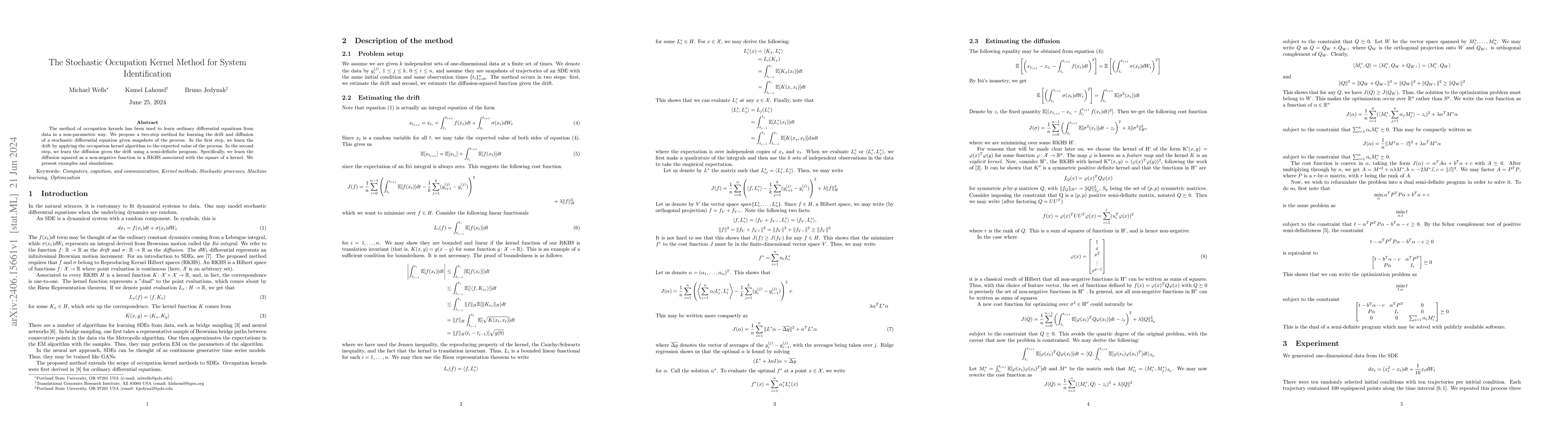 The paper introduces a two-step stochastic occupation kernel method to identify drift and diffusion terms in stochastic differential equations from data. It first learns the drift via occupation kernel applied to process means, then determines the diffusion squared as a non-negative function in a reproducing kernel Hilbert space, optimizing through a semi-definite program.