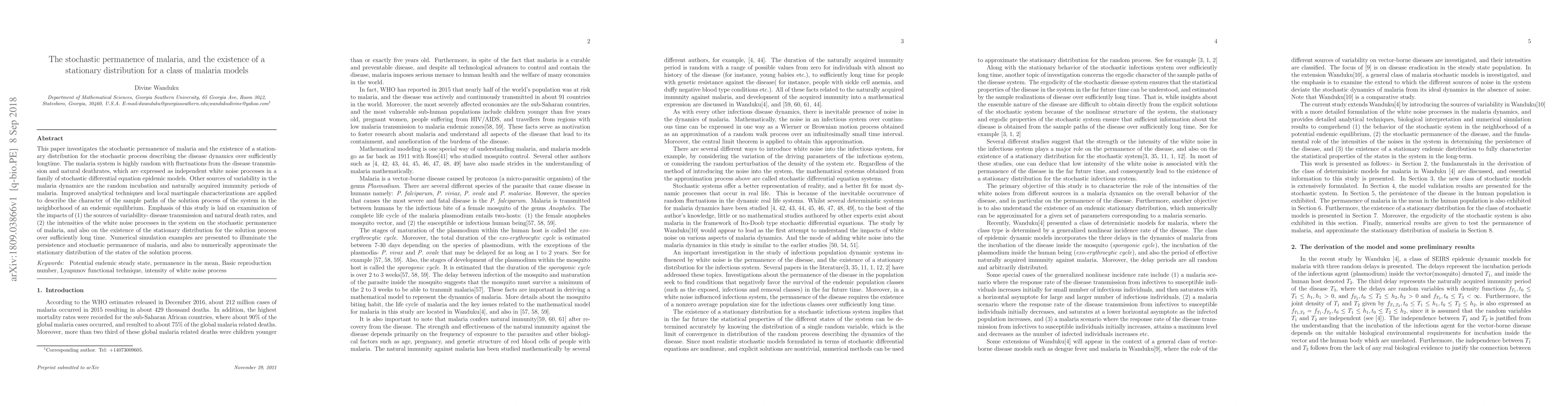 This paper investigates the stochastic permanence of malaria and the existence of a stationary distribution for the stochastic process describing the disease dynamics over sufficiently longtime. The malaria system is highly random with fluctuations from the disease transmission and natural deathrates, which are expressed as independent white noise processes in a family of stochastic differential equation epidemic models. Other sources of variability in the malaria dynamics are the random incubation and naturally acquired immunity periods of malaria. Improved analytical techniques and local martingale characterizations are applied to describe the character of the sample paths of the solution process of the system in the neighborhood of an endemic equilibrium. Emphasis of this study is laid on examination of the impacts of (1) the sources of variability- disease transmission and natural death rates, and (2) the intensities of the white noise processes in the system on the stochastic permanence of malaria, and also on the existence of the stationary distribution for the solution process over sufficiently long time. Numerical simulation examples are presented to illuminate the persistence and stochastic permanence of malaria, and also to numerically approximate the stationary distribution of the states of the solution process.