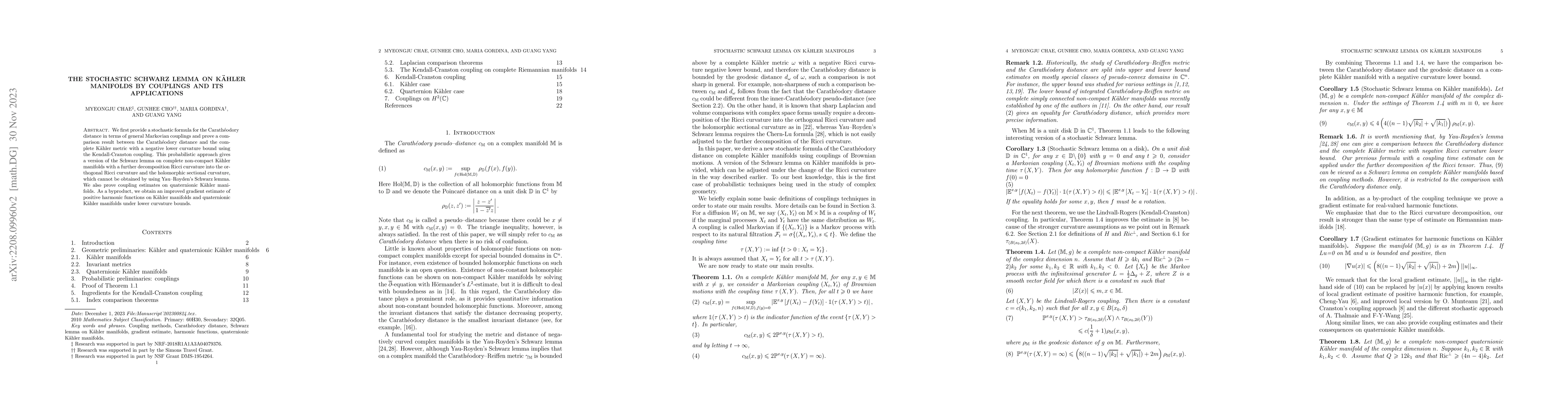 This paper presents a stochastic formula for the Carathéodory distance using Markovian couplings, proving a comparison with the Kähler metric on non-compact Kähler manifolds. It also provides a probabilistic version of the Schwarz lemma with a novel decomposition of Ricci curvature, yielding improved gradient estimates for harmonic functions on Kähler and quaternionic Kähler manifolds.