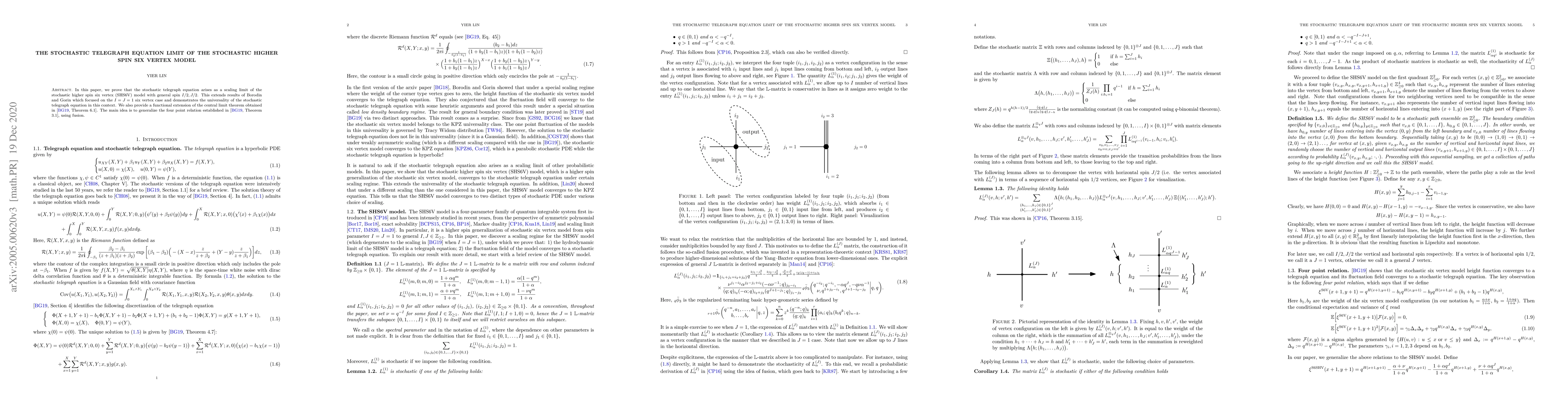 In this paper, we prove that the stochastic telegraph equation arises as a scaling limit of the stochastic higher spin six vertex (SHS6V) model with general spin $I/2, J/2$. This extends results of Borodin and Gorin which focused on the $I=J=1$ six vertex case and demonstrates the universality of the stochastic telegraph equation in this context. We also provide a functional extension of the central limit theorem obtained in [Borodin and Gorin 2019, Theorem 6.1]. The main idea is to generalize the four point relation established in [Borodin and Gorin 2019, Theorem 3.1], using fusion.