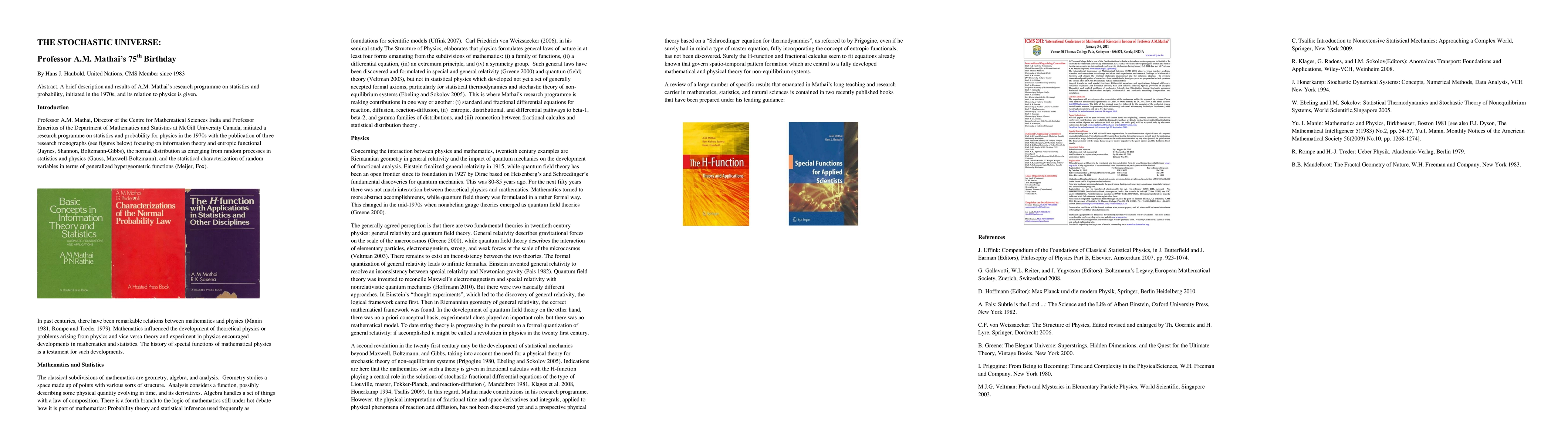 A brief description and results of A.M. Mathai's research programme on statistics and probability, initiated in the 1970s, and its relation to physics is given.