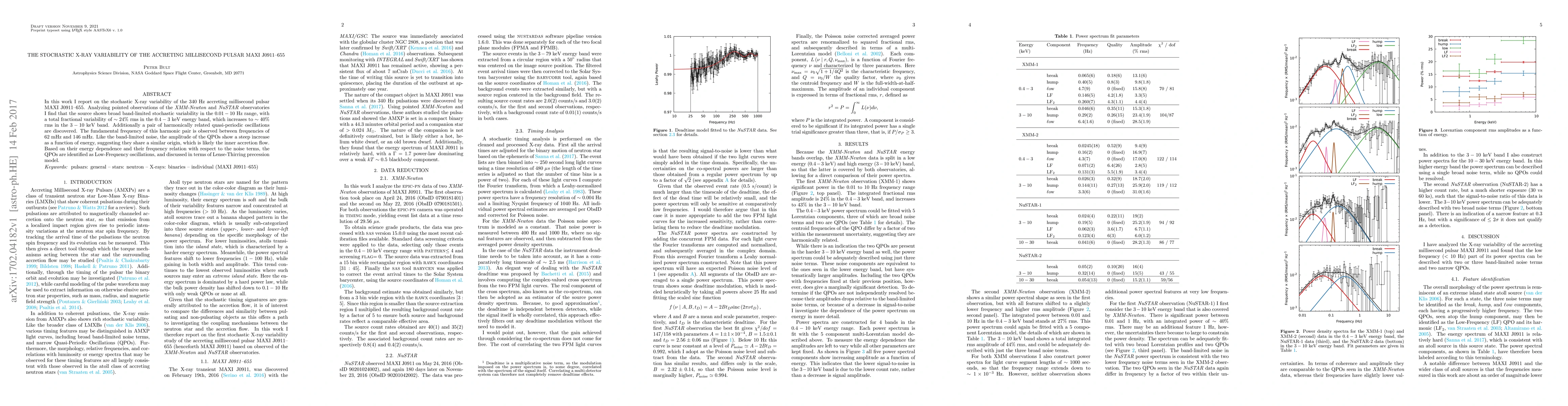 The accreting millisecond pulsar MAXI J0911-655 shows broad band-limited stochastic variability in its X-ray emissions, with a significant increase in amplitude at higher energies, and two harmonically related quasi-periodic oscillations detected in the noise.