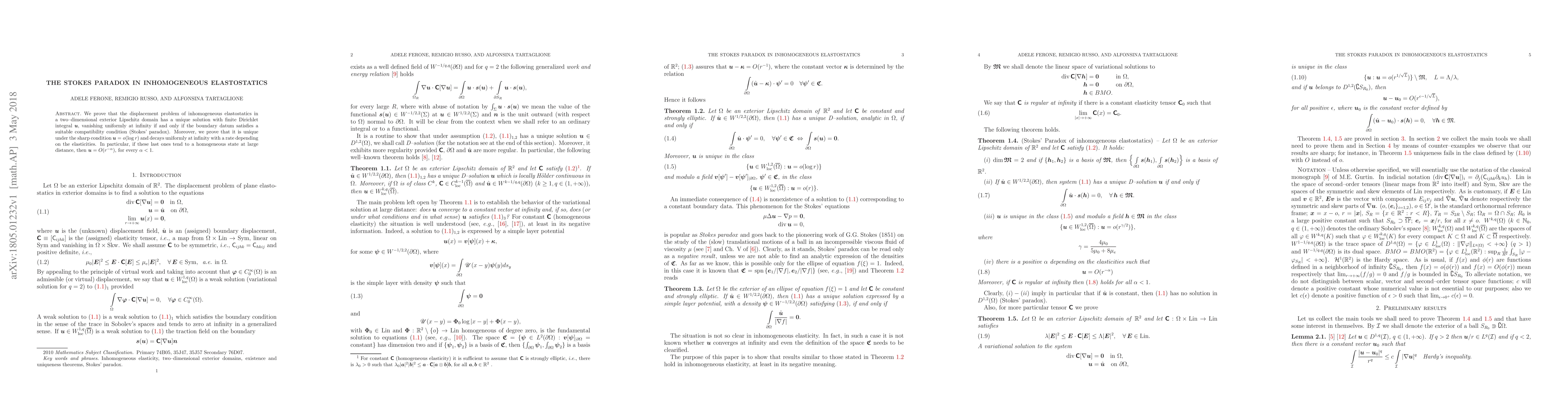 The paper proves that inhomogeneous elastostatics in a 2D domain has a unique solution with finite Dirichlet integral if the boundary datum satisfies a compatibility condition, and this solution decays uniformly at infinity under certain conditions.