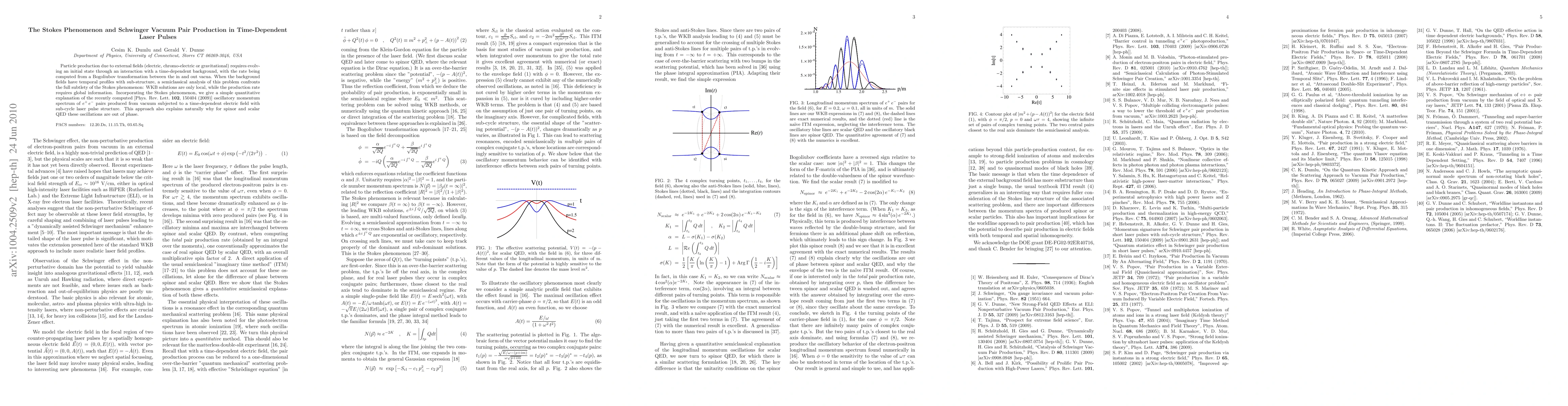 This paper explores particle production in time-dependent laser pulses, focusing on the Stokes phenomenon's role in understanding the oscillatory momentum spectrum of e+e- pairs. It provides a quantitative explanation for the observed oscillations and the phase difference between spinor and scalar QED.
