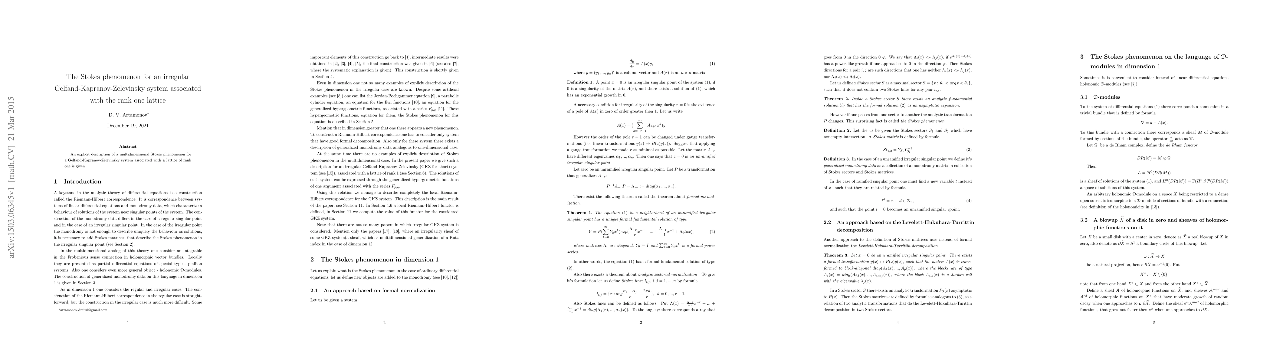 Summary: This paper provides an explicit description of the multidimensional Stokes phenomenon for a Gelfand-Kapranov-Zelevinsky system linked to a rank one lattice, offering insights into the behavior of solutions in complex geometries.