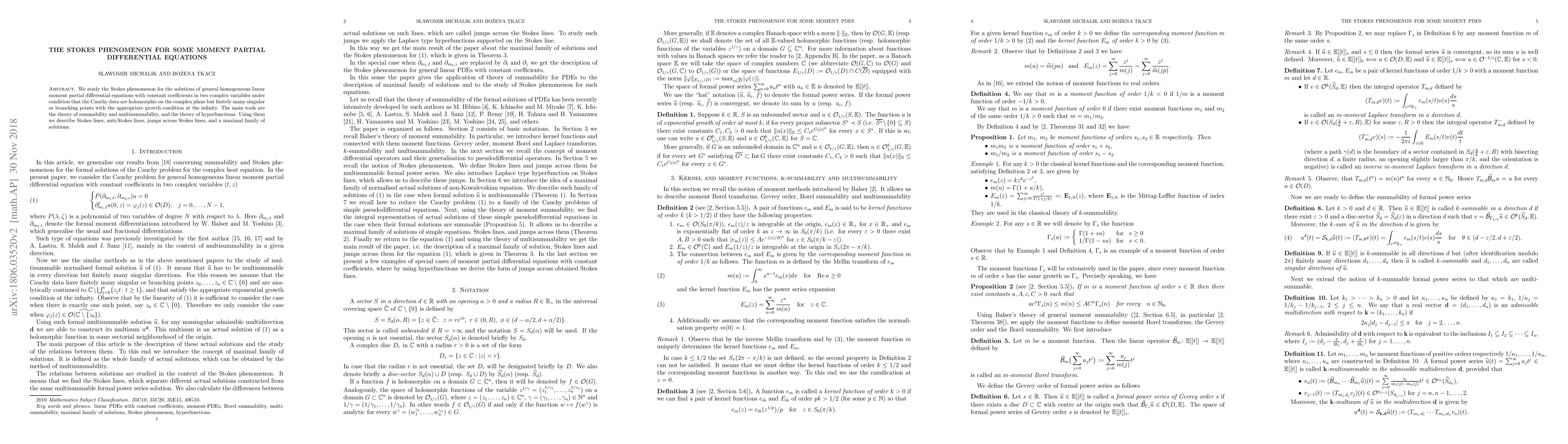 We study the Stokes phenomenon for the solutions of general homogeneous linear moment partial differential equations with constant coefficients in two complex variables under condition that the Cauchy data are holomorphic on the complex plane but finitely many singular or branching points with the appropriate growth condition at the infinity. The main tools are the theory of summability and multisummability, and the theory of hyperfunctions. Using them we describe Stokes lines, anti-Stokes lines, jumps across Stokes lines, and a maximal family of solutions.