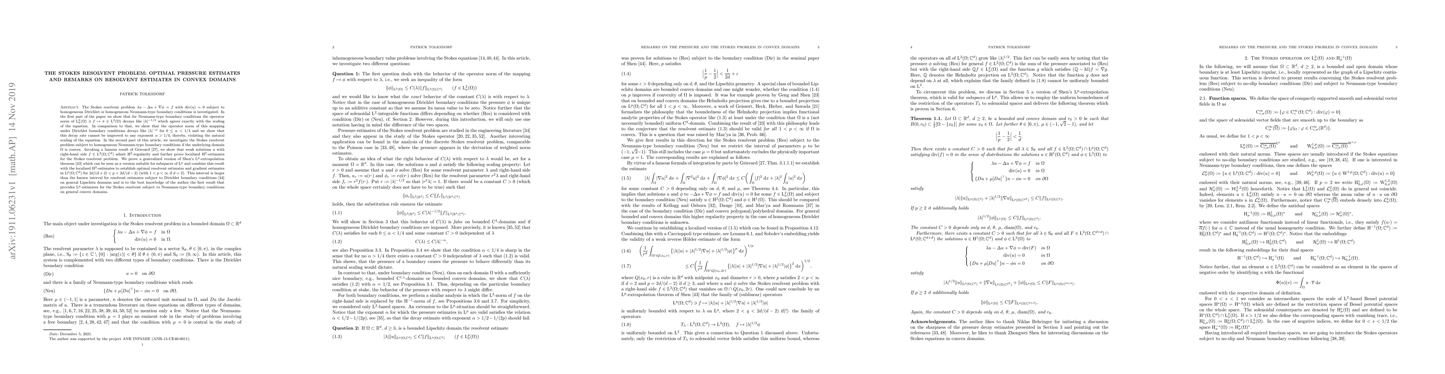 The Stokes resolvent problem $\lambda u - \Delta u + \nabla \phi = f$ with $\mathrm{div}(u) = 0$ subject to homogeneous Dirichlet or homogeneous Neumann-type boundary conditions is investigated. In the first part of the paper we show that for Neumann-type boundary conditions the operator norm of $\mathrm{L}^2_{\sigma} (\Omega) \ni f \mapsto \pi \in \mathrm{L}^2 (\Omega)$ decays like $\lvert \lambda \rvert^{- 1 / 2}$ which agrees exactly with the scaling of the equation. In comparison to that, we show that the operator norm of this mapping under Dirichlet boundary conditions decays like $\lvert \lambda \rvert^{- \alpha}$ for $0 \leq \alpha < 1 / 4$ and we show that this decay rate cannot be improved to any exponent $\alpha > 1 / 4$, thereby, violating the natural scaling of the equation. In the second part of this article, we investigate the Stokes resolvent problem subject to homogeneous Neumann-type boundary conditions if the underlying domain $\Omega$ is convex. We establish optimal resolvent estimates and gradient estimates in $\mathrm{L}^p (\Omega ; \mathbb{C}^d)$ for $2d / (d + 2) < p < 2d / (d - 2)$ (with $1 < p < \infty$ if $d = 2$). This interval is larger than the known interval for resolvent estimates subject to Dirichlet boundary conditions on general Lipschitz domains and is to the best knowledge of the author the first result that provides $\mathrm{L}^p$-estimates for the Stokes resolvent subject to Neumann-type boundary conditions on general convex domains.