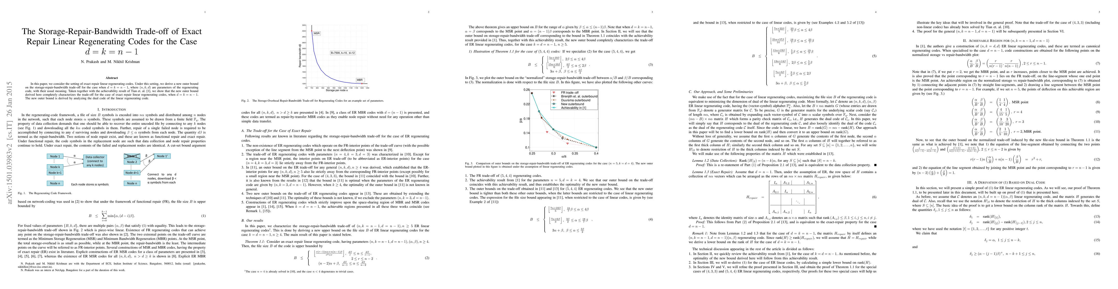 In this paper, we consider the setting of exact repair linear regenerating codes. Under this setting, we derive a new outer bound on the storage-repair-bandwidth trade-off for the case when $d = k = n -1$, where $(n, k, d)$ are parameters of the regenerating code, with their usual meaning. Taken together with the achievability result of Tian et. al. [1], we show that the new outer bound derived here completely characterizes the trade-off for the case of exact repair linear regenerating codes, when $d = k = n -1$. The new outer bound is derived by analyzing the dual code of the linear regenerating code.