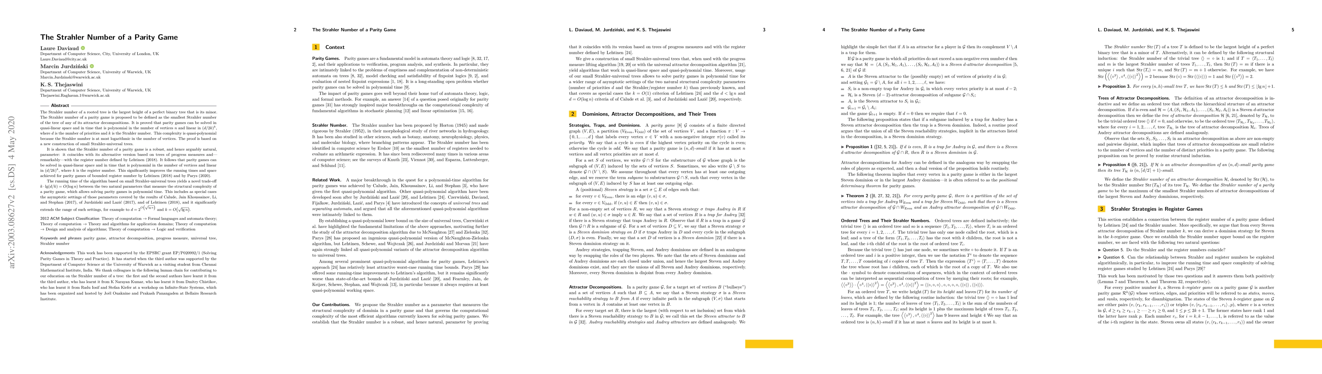This paper introduces the Strahler number for parity games, showing it is a robust parameter equivalent to the register number. It proposes an efficient algorithm to solve parity games in quasi-linear space and polynomial time, significantly improving previous results by leveraging small Strahler-universal trees.