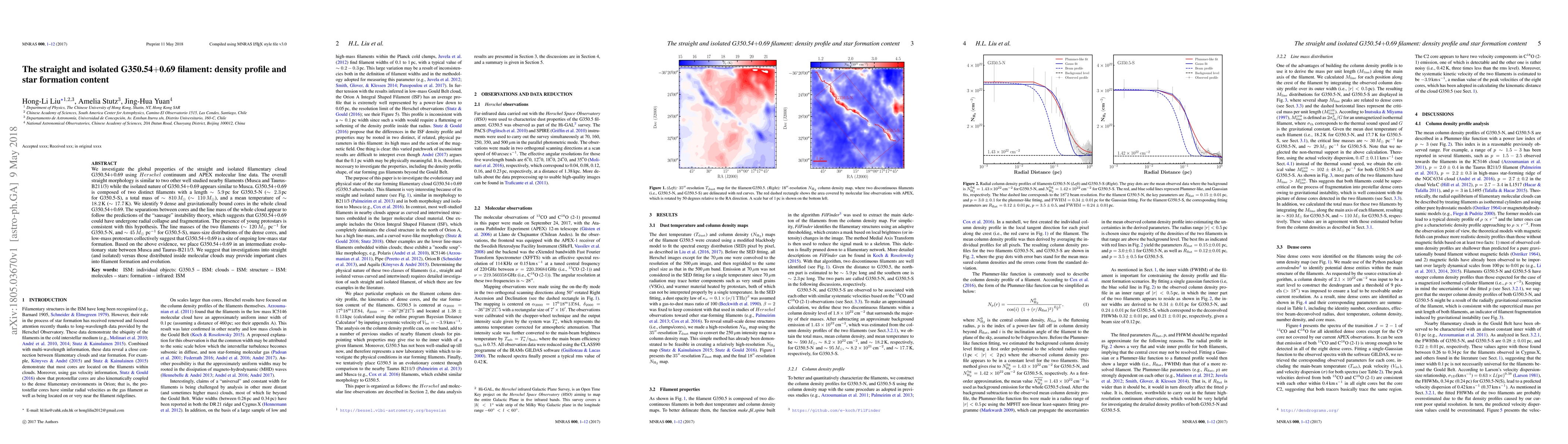 We investigate the global properties of the straight and isolated filamentary cloud G350.54+0.69 using Herschel continuum and APEX molecular line data. The overall straight morphology is similar to two other well studied nearby filaments (Musca and Taurus-B211/3) while the isolated nature of G350.54+0.69 appears similar to Musca. G350.54+0.69 is composed of two distinct filaments with a length ~5.9 pc for G350.5-N (~2.3 pc for G350.5-S), a total mass of ~810 $M_{\odot}$ (~ 110 $M_{\odot}$), and a mean temperature of ~ 18.2 K (~17.7 K). We identify 9 dense and gravitationally bound cores in the whole cloud G350.54+0.69. The separations between cores and the line mass of the whole cloud appear to follow the predictions of the "sausage" instability theory, which suggests that G350.54+0.69 could have undergone radial collapse and fragmentation. The presence of young protostars is consistent with this hypothesis. The line masses of the two filaments (~120 $M_{\odot}$ pc$^{-1}$ for G350.5-N, and ~45 $M_{\odot}$ pc$^{-1}$ for G350.5-S), mass-size distributions of the dense cores, and low-mass protostars collectively suggest that G350.54+0.69 is a site of ongoing low-mass star formation. Based on the above evidence, we place G350.54+0.69 in an intermediate evolutionary state between Musca and Taurus-B211/3. We suggest that investigations into straight (and isolated) versus those distributed inside molecular clouds may provide important clues into filament formation and evolution.