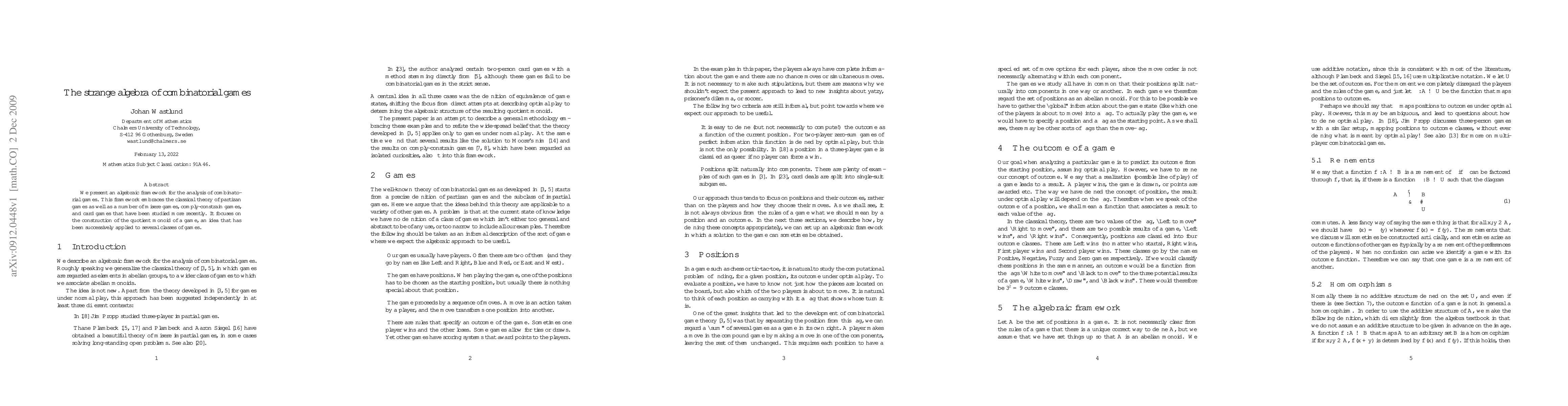 This paper introduces an algebraic framework for analyzing combinatorial games, encompassing both classical and recent types, and emphasizes the construction of the quotient monoid to study game structures.
