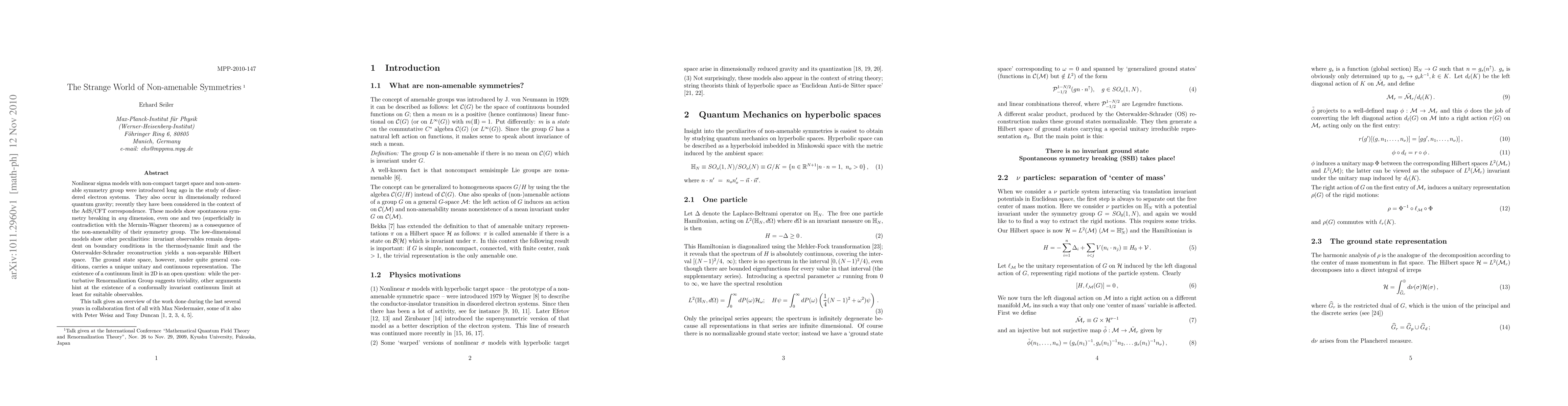 Nonlinear sigma models with non-compact target space and non-amen-able symmetry group were introduced long ago in the study of disordered electron systems. They also occur in dimensionally reduced quantum gravity; recently they have been considered in the context of the AdS/CFT correspondence. These models show spontaneous symmetry breaking in {\it any} dimension, even one and two (superficially in contradiction with the Mermin-Wagner theorem) as a consequence of the non-amenability of their symmetry group. The low-dimensional models show other peculiarities: invariant observables remain dependent on boundary conditions in the thermodynamic limit and the Osterwalder-Schrader reconstruction yields a non-separable Hilbert space. The ground state space, however, under quite general conditions, carries a unique unitary and continuous representation. The existence of a continuum limit in 2D is an open question: while the perturbative Renormalization Group suggests triviality, other arguments hint at the existence of a conformally invariant continuum limit at least for suitable observables. This talk gives an overview of the work done during the last several years in collaboration first of all with Max Niedermaier, some of it also with Peter Weisz and Tony Duncan.