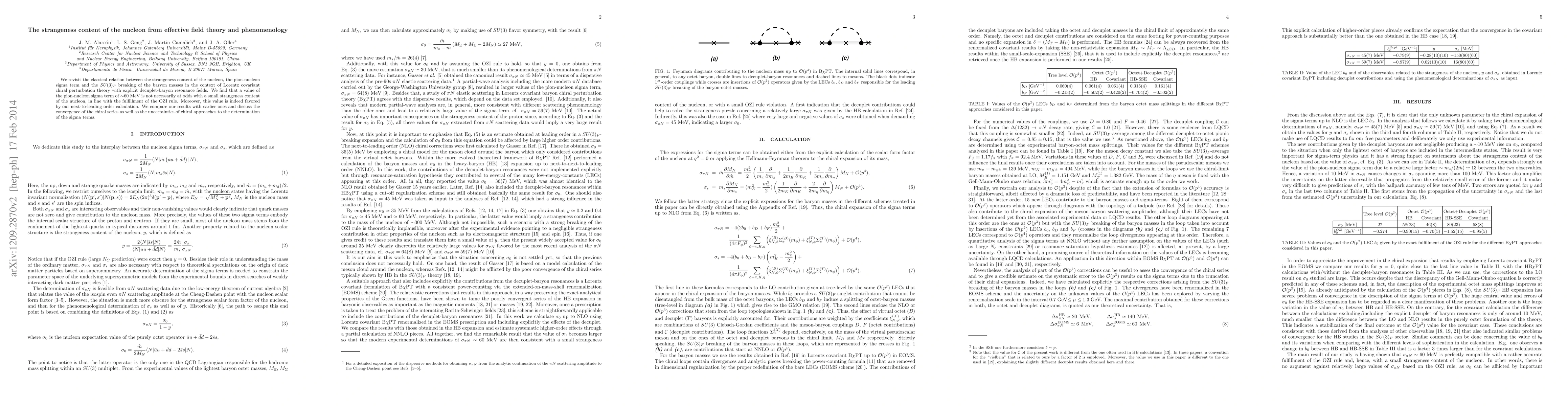 We revisit the classical relation between the strangeness content of the nucleon, the pion-nucleon sigma term and the $SU(3)_F$ breaking of the baryon masses in the context of Lorentz covariant chiral perturbation theory with explicit decuplet-baryon resonance fields. We find that a value of the pion-nucleon sigma term of $\sim$60 MeV is not necessarily at odds with a small strangeness content of the nucleon, in line with the fulfillment of the OZI rule. Moreover, this value is indeed favored by our next-to-leading order calculation. We compare our results with earlier ones and discuss the convergence of the chiral series as well as the uncertainties of chiral approaches to the determination of the sigma terms.