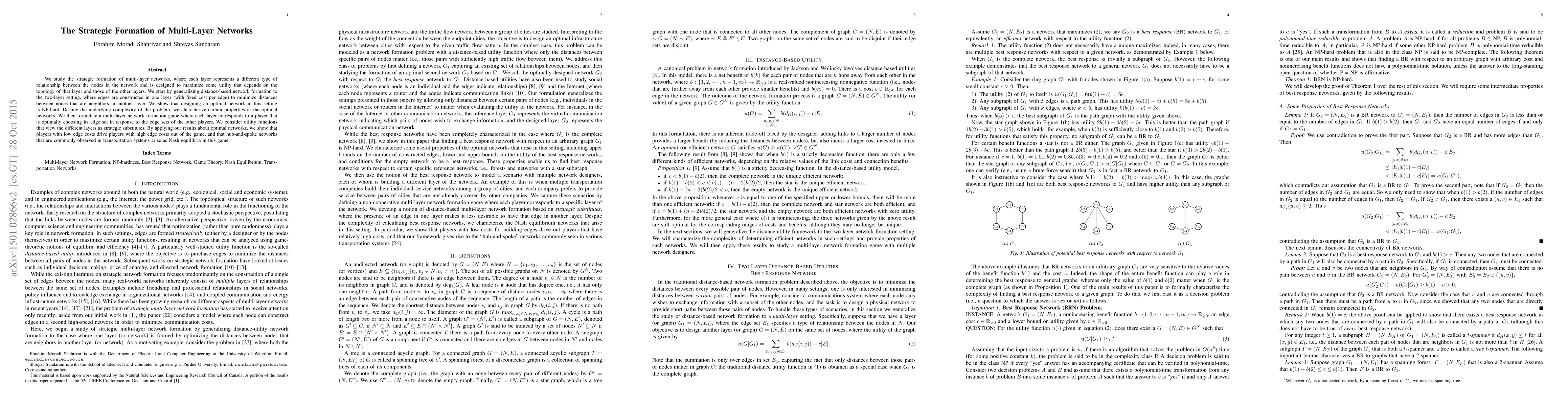 This paper investigates the strategic formation of multi-layer networks, where each layer represents different relationships, aiming to maximize utility based on network topology. It demonstrates the NP-hardness of designing optimal networks and identifies properties of these networks, then explores a multi-layer network formation game where players strategically choose edges, leading to hub-and-spoke structures as Nash equilibria.