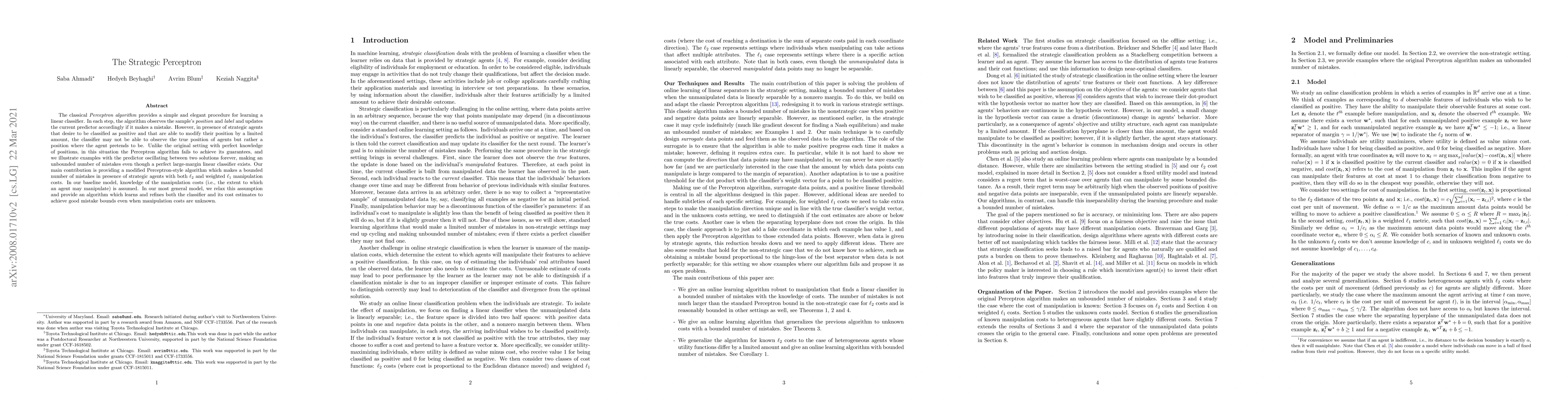 The paper discusses the limitations of the classical Perceptron algorithm when strategic agents manipulate their positions to influence classification. It proposes a modified Perceptron-style algorithm that achieves bounded mistake bounds even when agents have limited manipulation costs, and extends this to a scenario where manipulation costs are unknown.