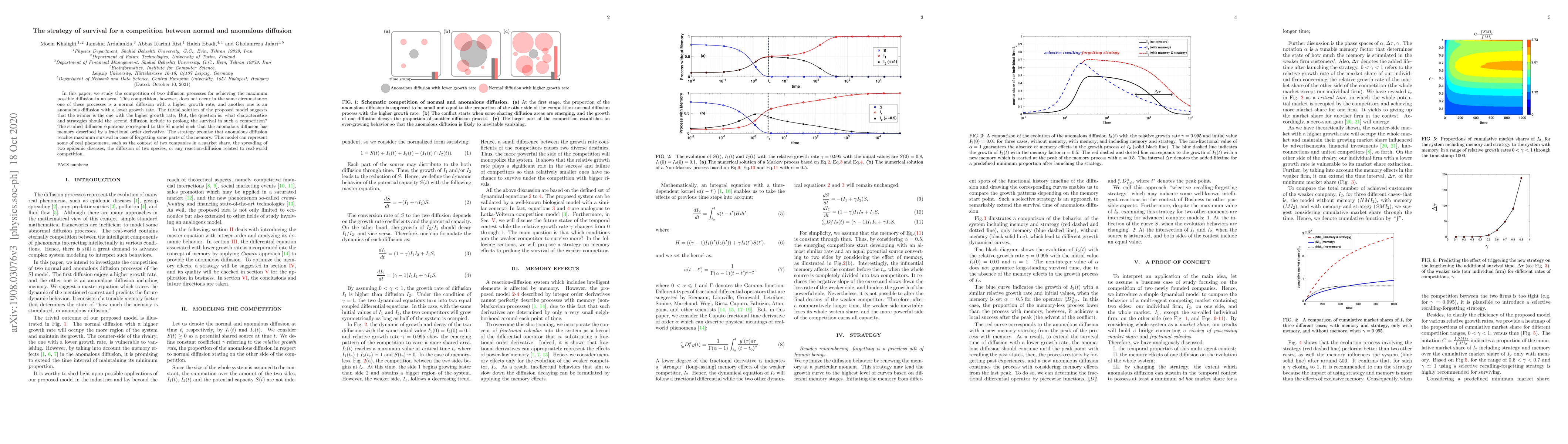 In this paper, we study the competition of two diffusion processes for achieving the maximum possible diffusion in an area. This competition, however, does not occur in the same circumstance; one of these processes is a normal diffusion with a higher growth rate, and another one is an anomalous diffusion with a lower growth rate. The trivial solution of the proposed model suggests that the winner is the one with the higher growth rate. But, the question is: what characteristics and strategies should the second diffusion include to prolong the survival in such a competition? The studied diffusion equations correspond to the SI model such that the anomalous diffusion has memory described by a fractional order derivative. The strategy promise that anomalous diffusion reaches maximum survival in case of forgetting some parts of the memory. This model can represent some of real phenomena, such as the contest of two companies in a market share, the spreading of two epidemic diseases, the diffusion of two species, or any reaction-diffusion related to real-world competition.