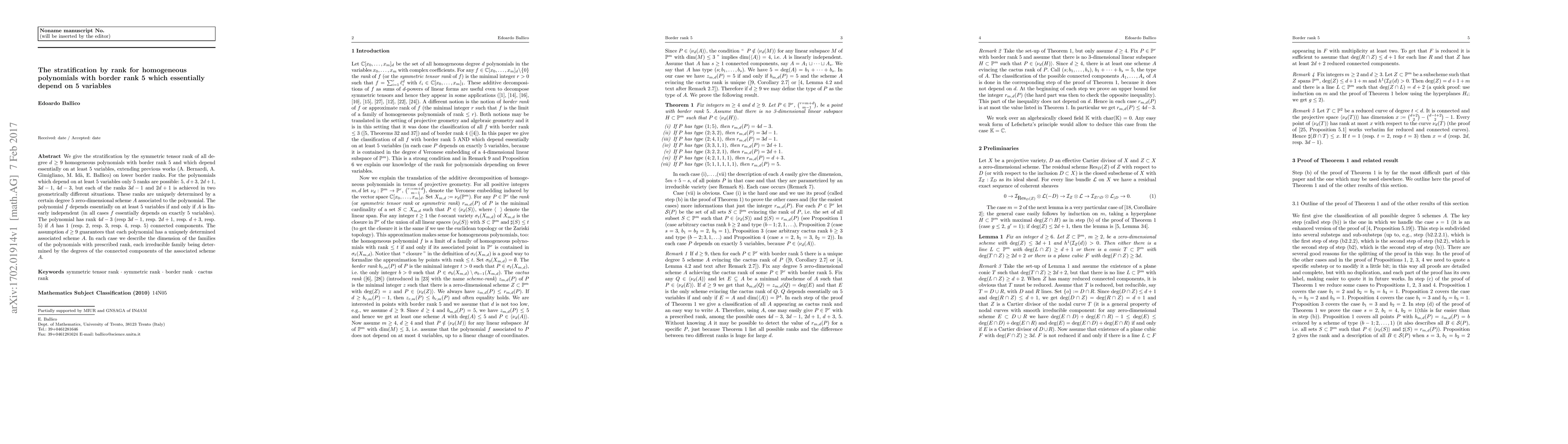 Researchers found that homogeneous polynomials with border rank 5 depend on exactly 5 variables when they have a unique degree 5 zero-dimensional scheme associated with them. The polynomials can have ranks from 5 to 4d-3 depending on the connected components of this scheme.