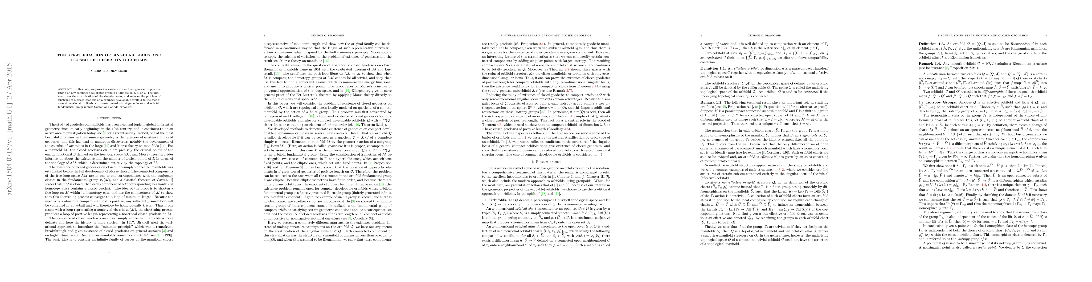 Researchers prove that a closed geodesic of positive length exists on compact developable orbifolds of dimensions 3, 5, or 7. This finding is achieved through the stratification of singular locus.
