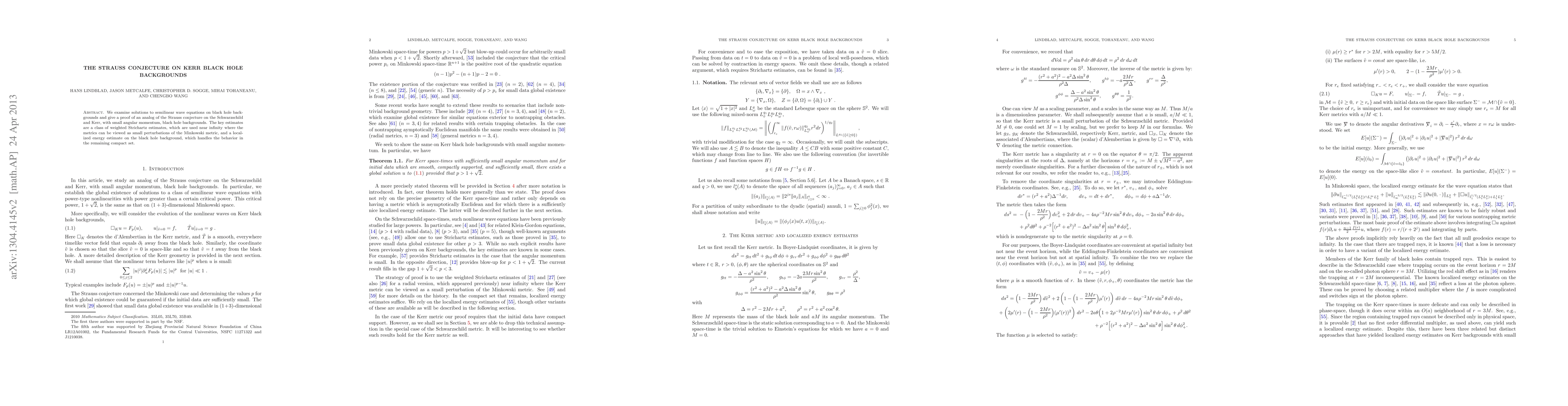 We examine solutions to semilinear wave equations on black hole backgrounds and give a proof of an analog of the Strauss conjecture on the Schwarzschild and Kerr, with small angular momentum, black hole backgrounds. The key estimates are a class of weighted Strichartz estimates, which are used near infinity where the metrics can be viewed as small perturbations of the Minkowski metric, and a localized energy estimate on the black hole background, which handles the behavior in the remaining compact set.