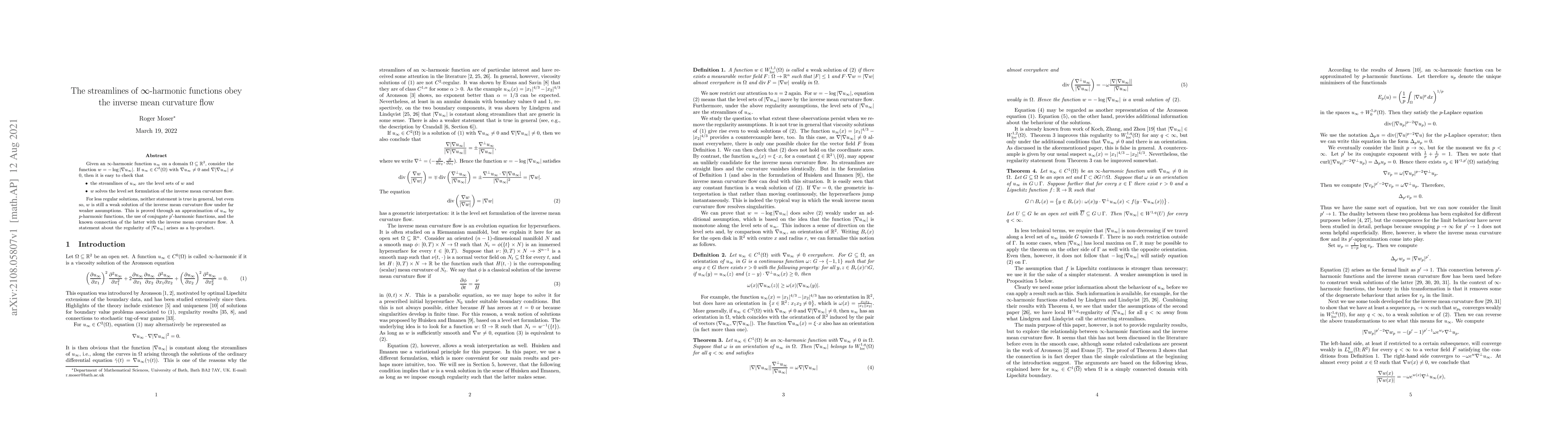 Given an $\infty$-harmonic function $u_\infty$ on a domain $\Omega \subseteq \mathbb{R}^2$, consider the function $w = -\log |\nabla u_\infty|$. If $u_\infty \in C^2(\Omega)$ with $\nabla u_\infty \neq 0$ and $\nabla |\nabla u_\infty| \neq 0$, then it is easy to check that (1) the streamlines of $u_\infty$ are the level sets of $w$ and (2) $w$ solves the level set formulation of the inverse mean curvature flow. For less regular solutions, neither statement is true in general, but even so, $w$ is still a weak solution of the inverse mean curvature flow under far weaker assumptions. This is proved through an approximation of $u_\infty$ by $p$-harmonic functions, the use of conjugate $p'$-harmonic functions, and the known connection of the latter with the inverse mean curvature flow. A statement about the regularity of $|\nabla u_\infty|$ arises as a by-product.