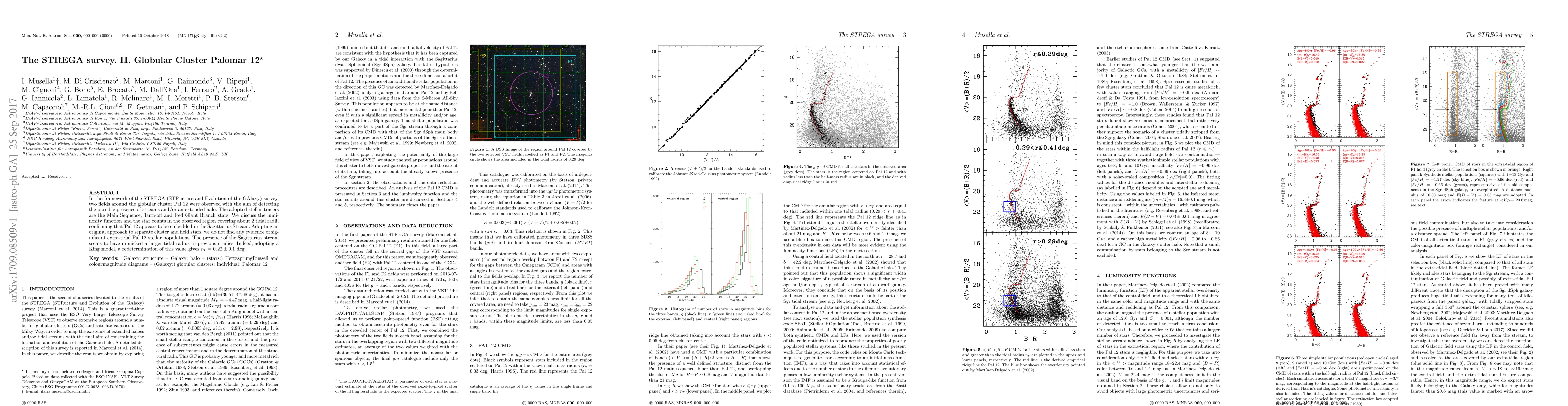 In the framework of the STREGA (STRucture and Evolution of the GAlaxy) survey, two fields around the globular cluster Pal 12 were observed with the aim of detecting the possible presence of streams and/or an extended halo. The adopted stellar tracers are the Main Sequence, Turn-off and Red Giant Branch stars. We discuss the lumi- nosity function and the star counts in the observed region covering about 2 tidal radii, confirming that Pal 12 appears to be embedded in the Sagittarius Stream. Adopting an original approach to separate cluster and field stars, we do not find any evidence of sig- nificant extra-tidal Pal 12 stellar populations. The presence of the Sagittarius stream seems to have mimicked a larger tidal radius in previous studies. Indeed, adopting a King model, a redetermination of this value gives r_T = 0.22 +- 0.1 deg.