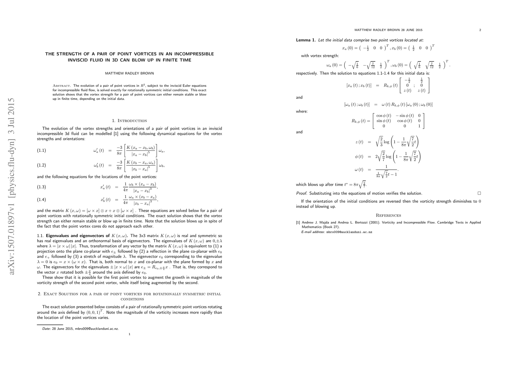 Summary: An exact solution for a pair of point vortices in an inviscid fluid reveals that vortex strength can remain stable or blow up in finite time, contingent on initial conditions. This finding highlights the potential for extreme dynamics in vortex systems.