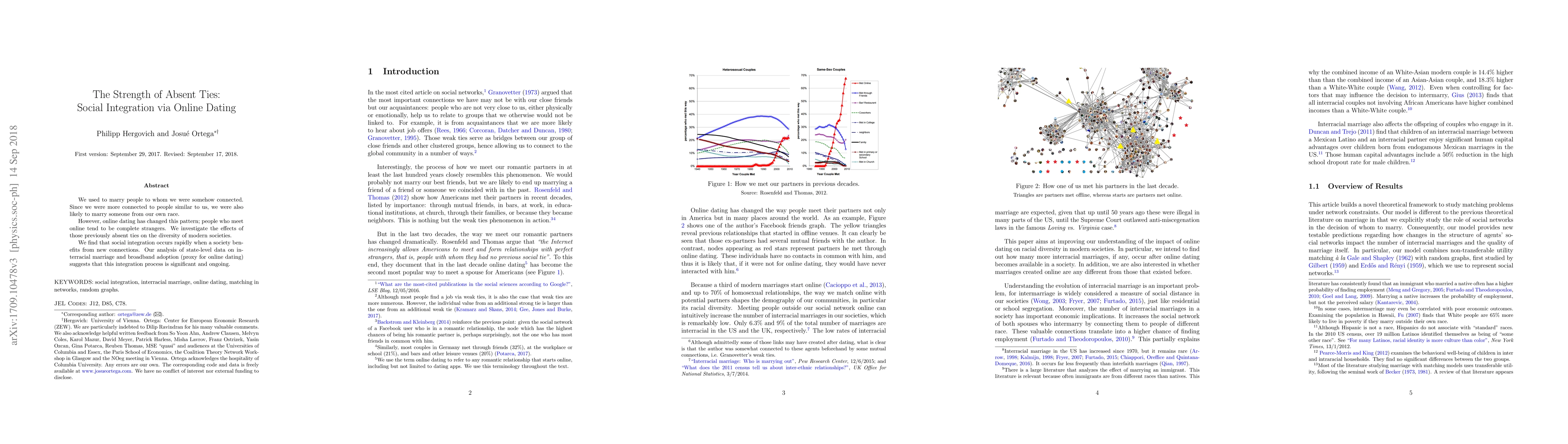 Summary: Online dating has altered traditional marriage patterns by connecting individuals with little prior social ties, leading to increased interracial marriages. The analysis of state-level data shows a significant correlation between broadband adoption and rising interracial marriages, indicating rapid social integration facilitated by online connections.