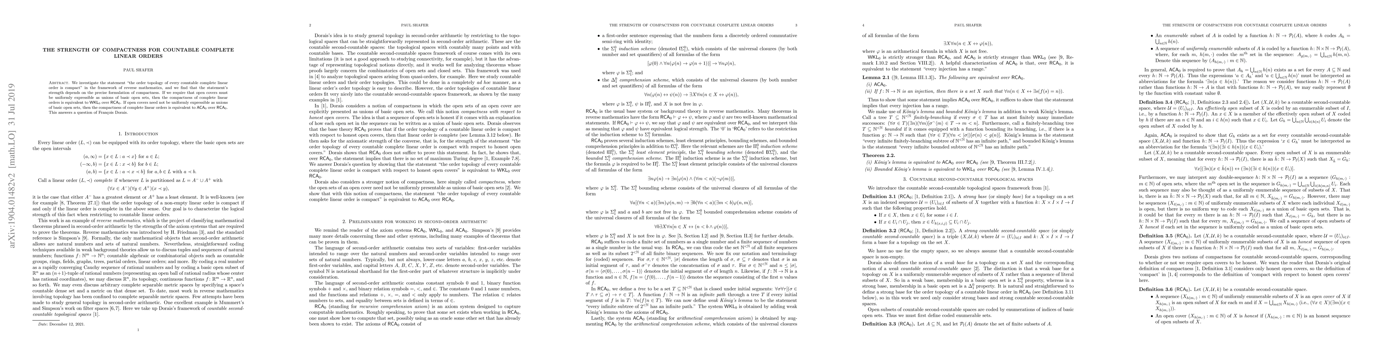 We investigate the statement "the order topology of every countable complete linear order is compact" in the framework of reverse mathematics, and we find that the statement's strength depends on the precise formulation of compactness. If we require that open covers must be uniformly expressible as unions of basic open sets, then the compactness of complete linear orders is equivalent to $\mathsf{WKL}_0$ over $\mathsf{RCA}_0$. If open covers need not be uniformly expressible as unions of basic open sets, then the compactness of complete linear orders is equivalent to $\mathsf{ACA}_0$ over $\mathsf{RCA}_0$. This answers a question of Fran\c{c}ois Dorais.