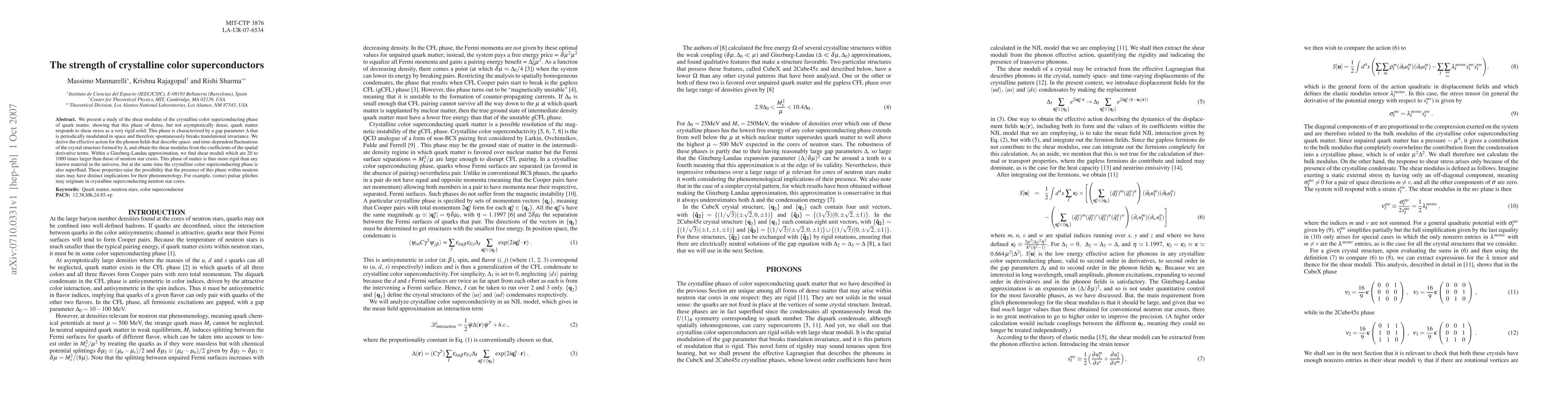 This study investigates the shear modulus of crystalline color superconducting quark matter, revealing it to be exceptionally rigid, with moduli 20 to 1000 times greater than those of neutron star crusts. The research suggests that this superfluid, rigid phase could influence neutron star phenomenology, potentially explaining certain pulsar glitches.